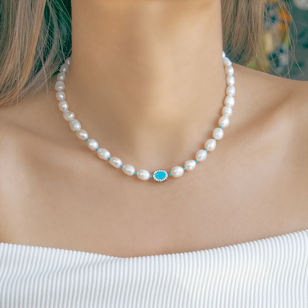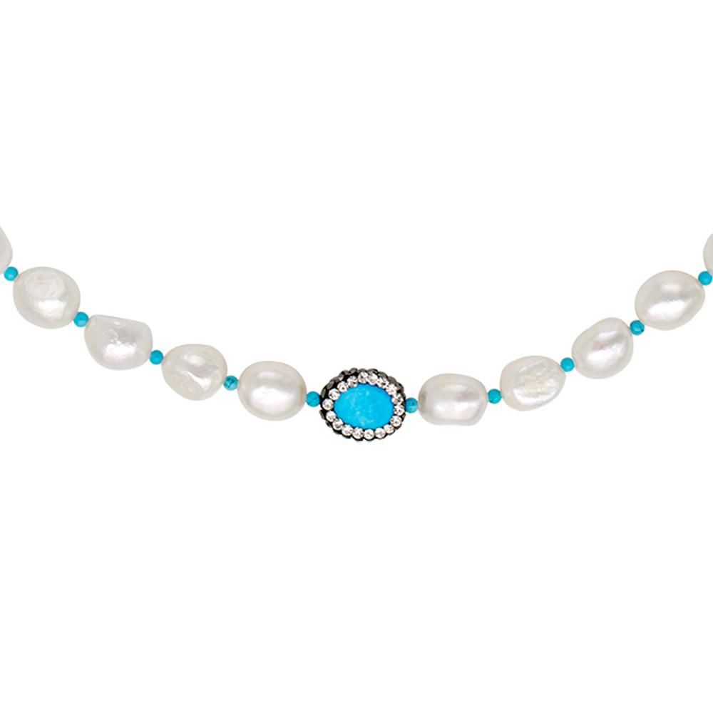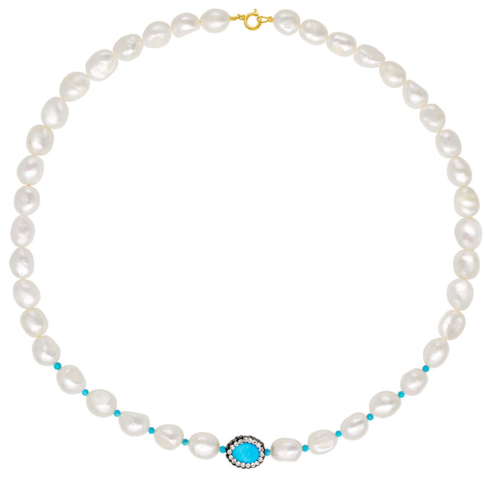 Κολιέ με Κ14 χρυσό κούμπωμα, μαργαριτάρια και τιρκουάζ - F124390