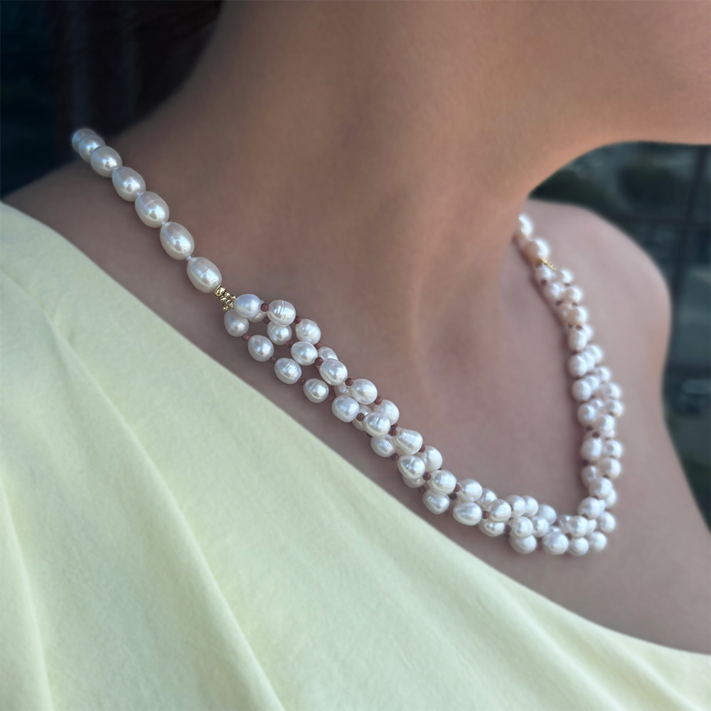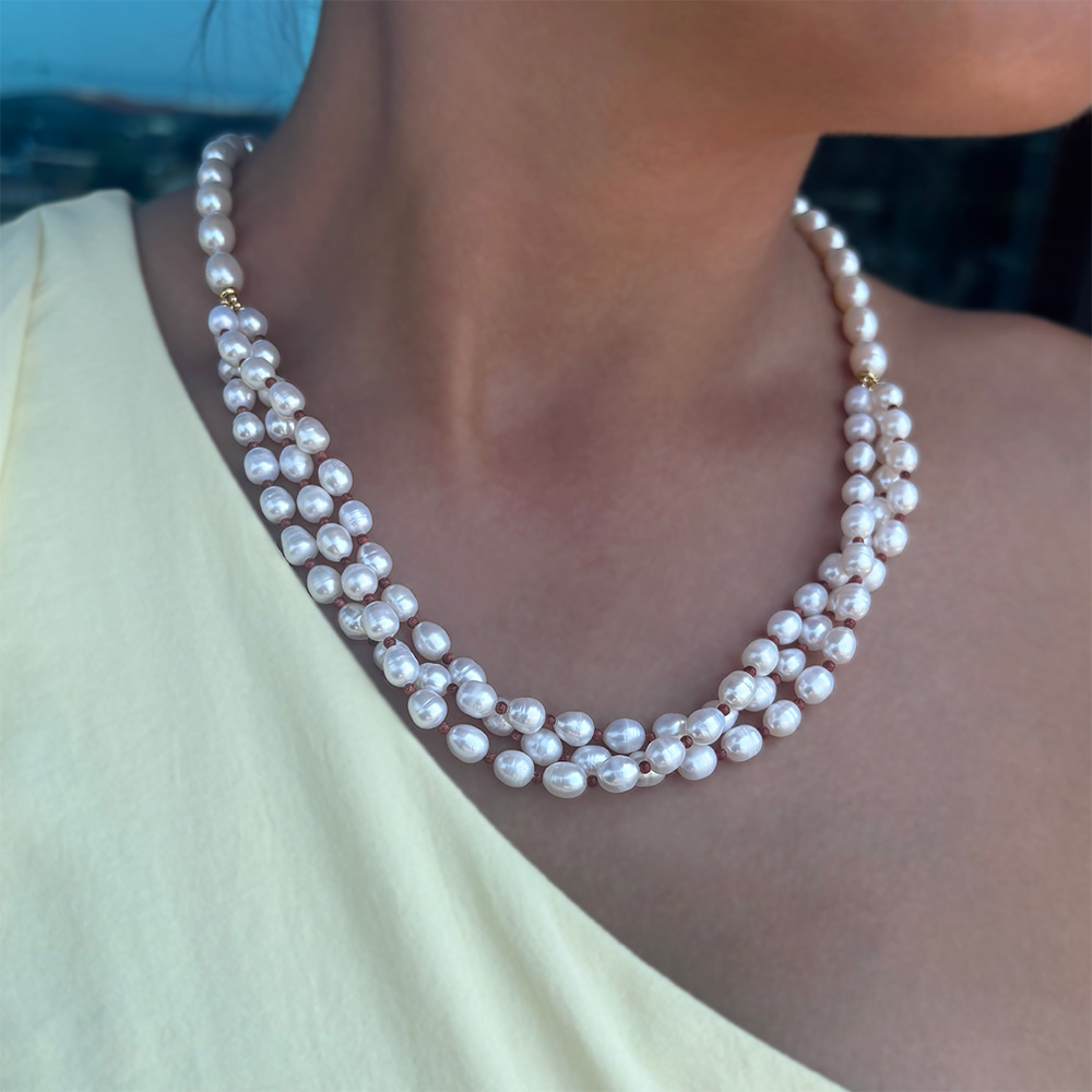Είναι δεμένο σε μεταξωτό νήμα που δημιουργεί κόμπους ανάμεσα στα μαργαριτάρια για λόγους προστασίας και ασφάλειας.