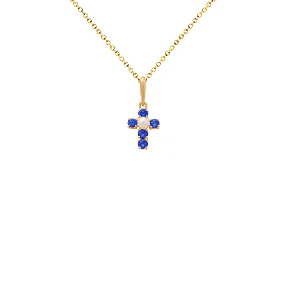 Κολιέ με Κ14 χρυσή αλυσίδα και σταυρό με ζαφείρια και μαργαριτάρι - F125285SCH