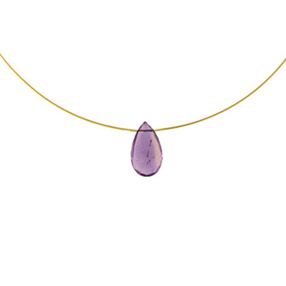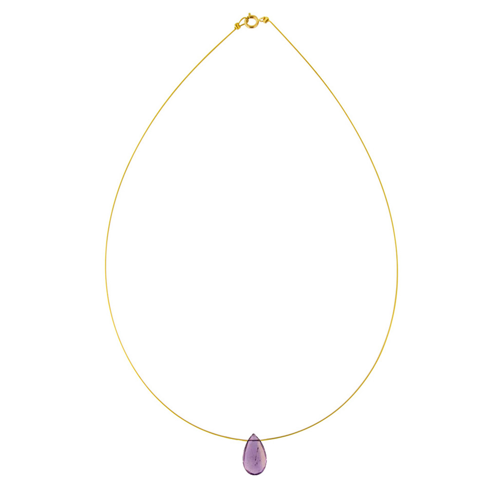 • Ένα υπέροχο κολιέ με μία εντυπωσιακή σταγόνα Αμέθυστο , μέγεθος από 8 έως 14 χιλιοστά και χρυσό κούμπωμα 14 καρατίων.