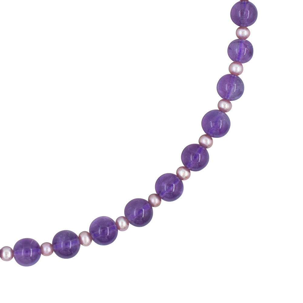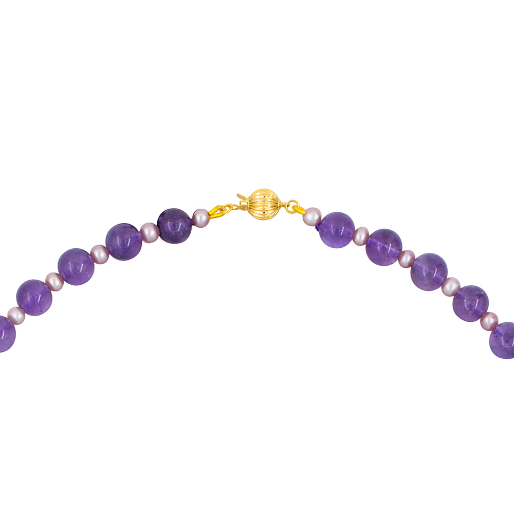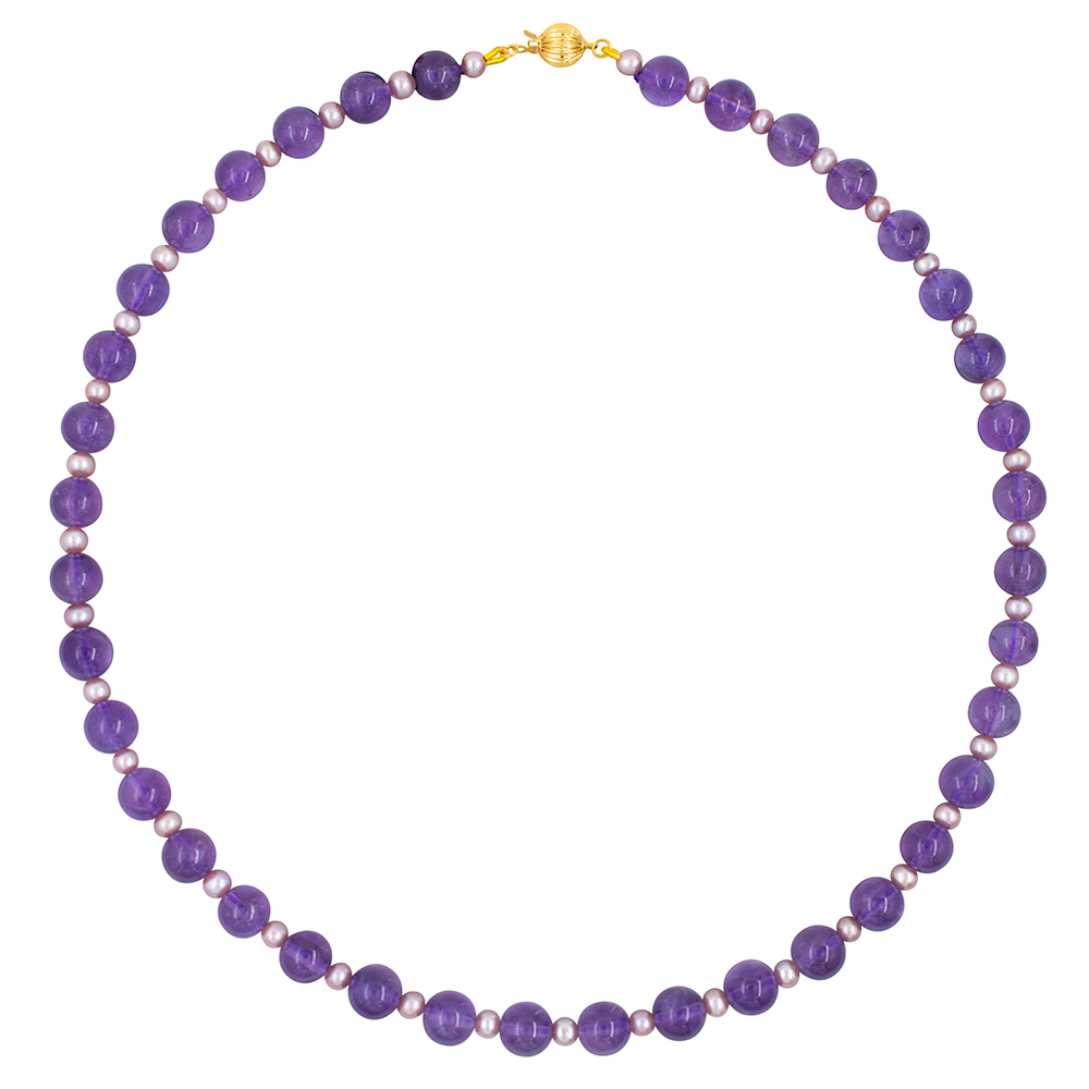• Ένα υπέροχο κολιέ με στρόγγυλο ημιπολύτιμο λίθο Αμέθυστουδιαμέτρου 8 χιλιοστών, λείας κοπής.