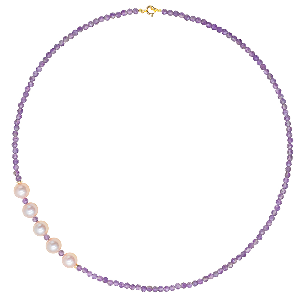 • Ένα εντυπωσιακό κολιέ με ημιπολύτιμο λίθο Amethyst διαμέτρου 3-3,5 χιλιοστών και 5 σομόν μαργαριτάρια Fresh Water Pearl διαμέτρου 8-9 χιλιοστών.