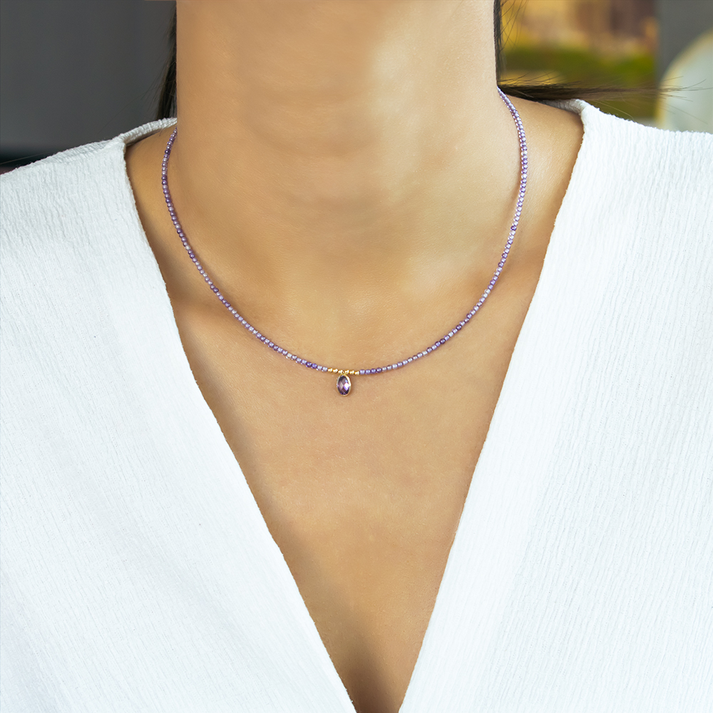 Στο κέντρο του κολιέ υπάρχει ένα εντυπωσιακό μενταγιόν με Amethyst CZ σε χρυσό καστόνι 14 καρατιών διαμέτρου 5x7 χιλιοστών.