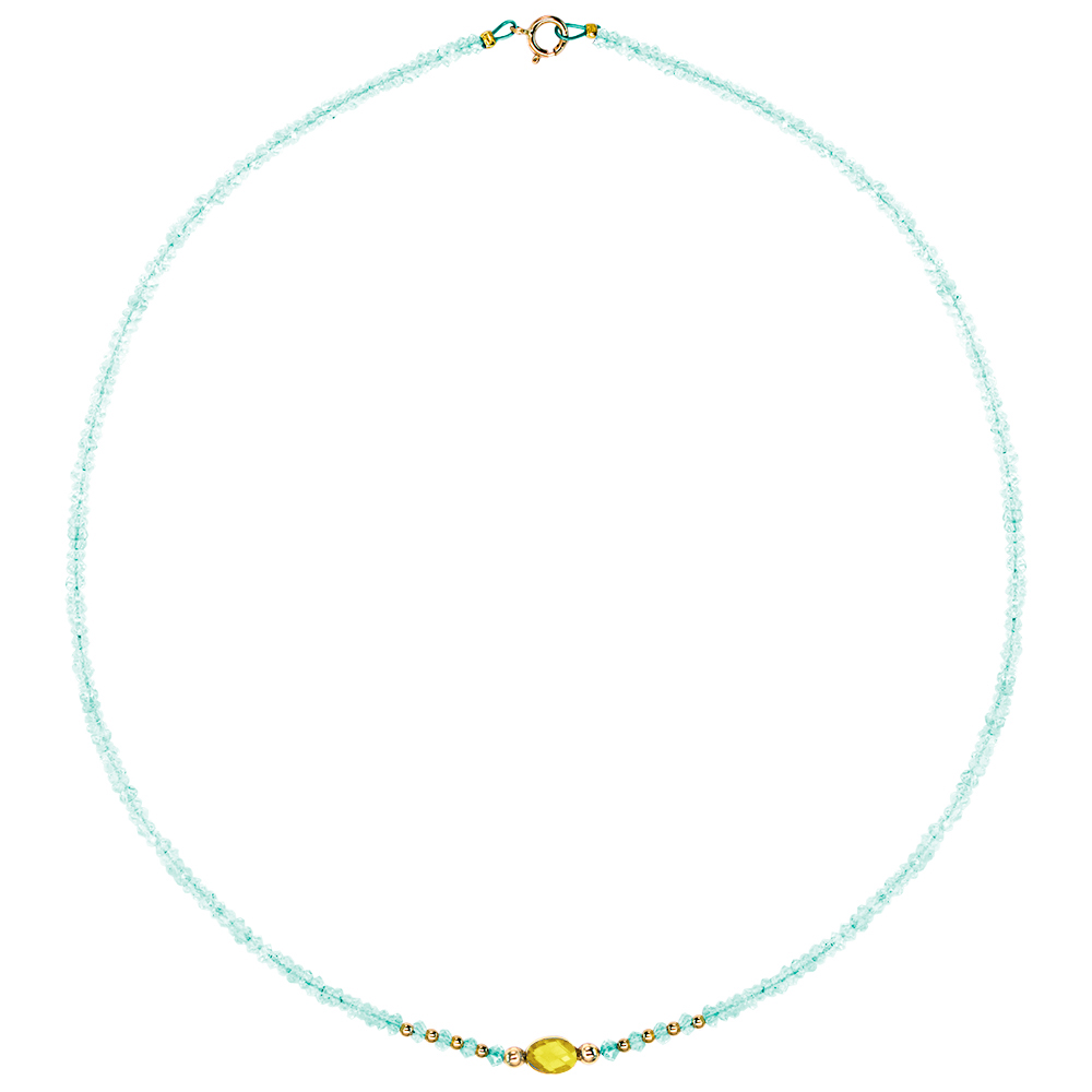 • Ένα εντυπωσιακό κολιέ με ημιπολύτιμο λίθο Aqua διαμέτρου 2-2,5 χιλιοστών και χρυσό κούμπωμα 14 καρατίων.