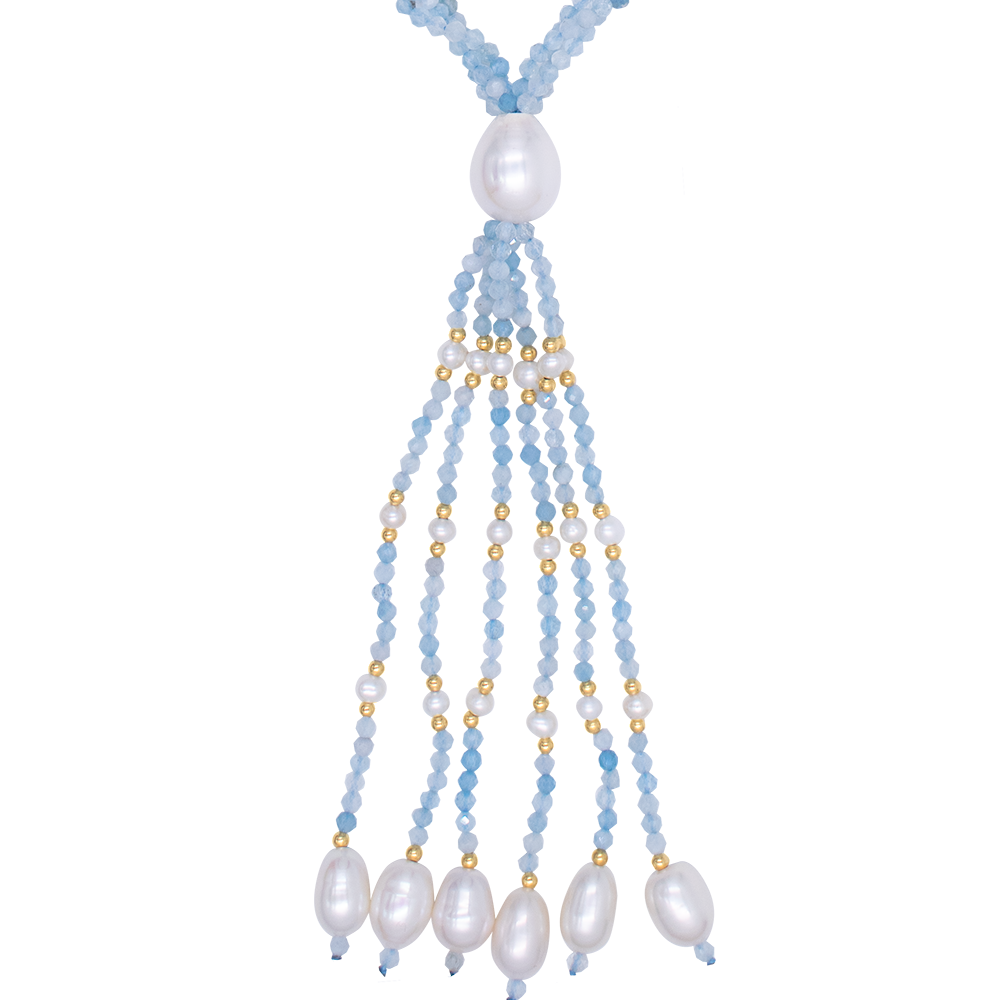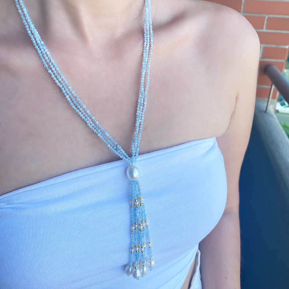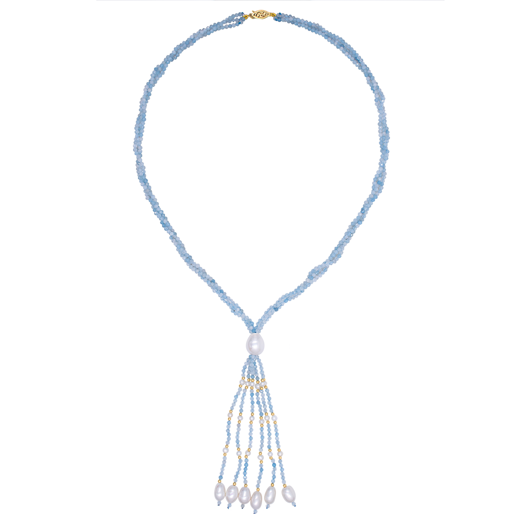 Κολιέ με aqua, μαργαριτάρια και χρυσά στοιχεία Κ14 - M125279