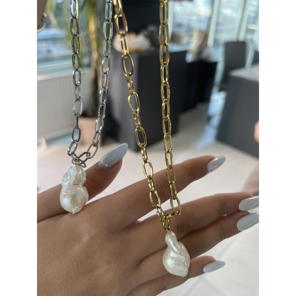 Κολιέ με ατσάλινη αλυσίδα και λευκό μαργαριτάρι Baroque - G125100