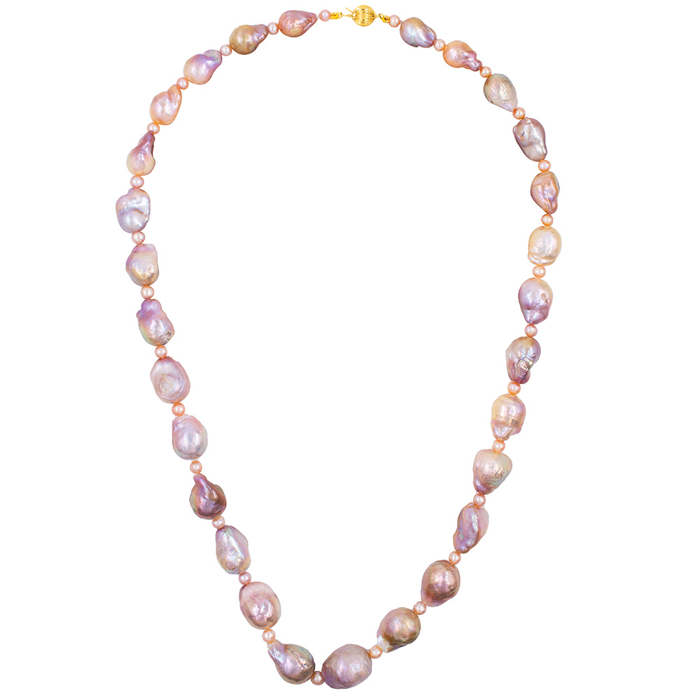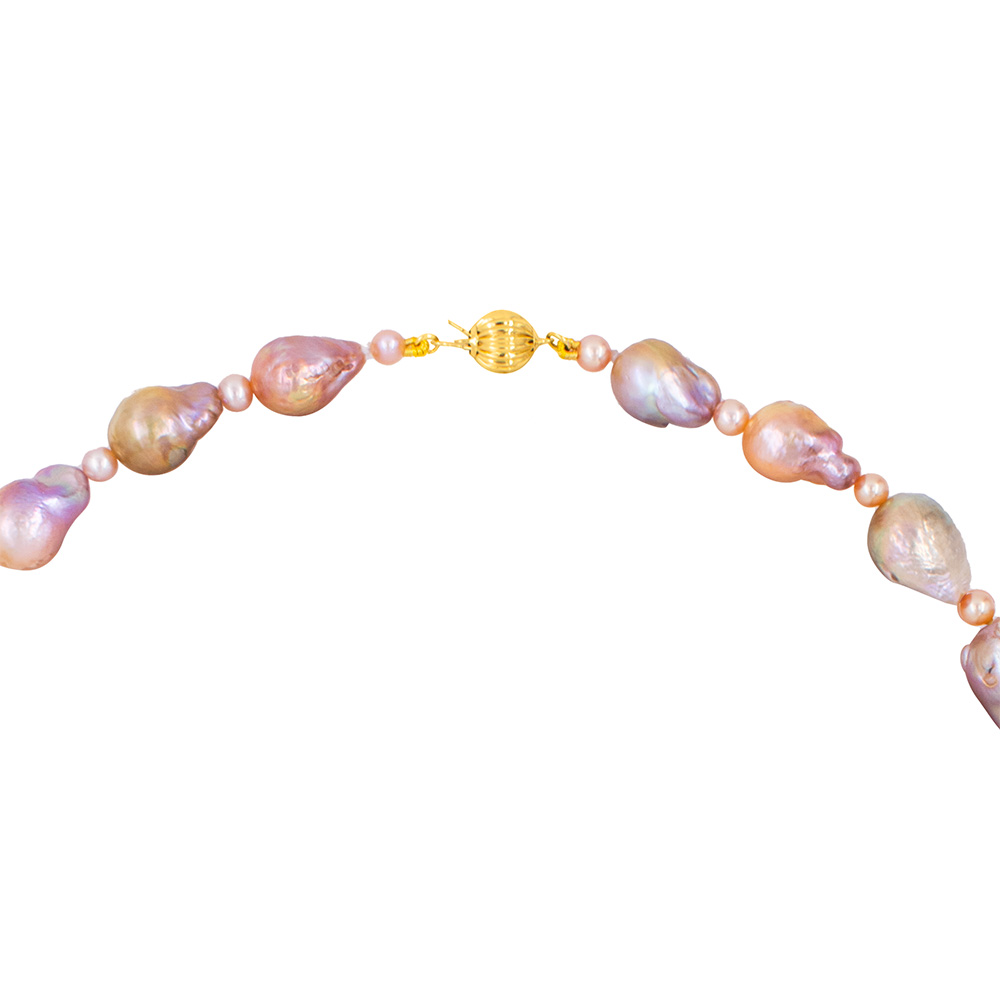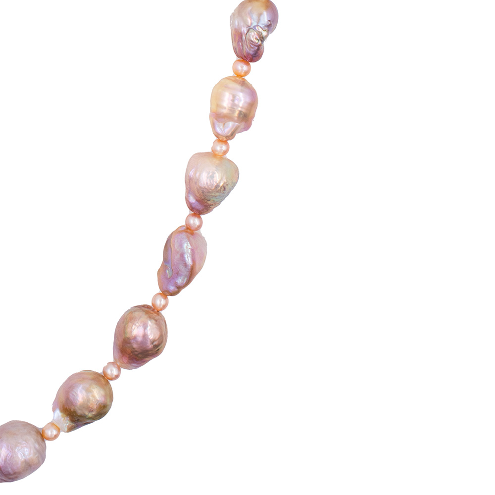 • Ένα υπέροχο κολιέ με μαργαριτάρια Fresh Water Pearl διαμέτρου 12x18 χιλιοστών Baroque με φυσικούς σομόν ιριδισμούς.