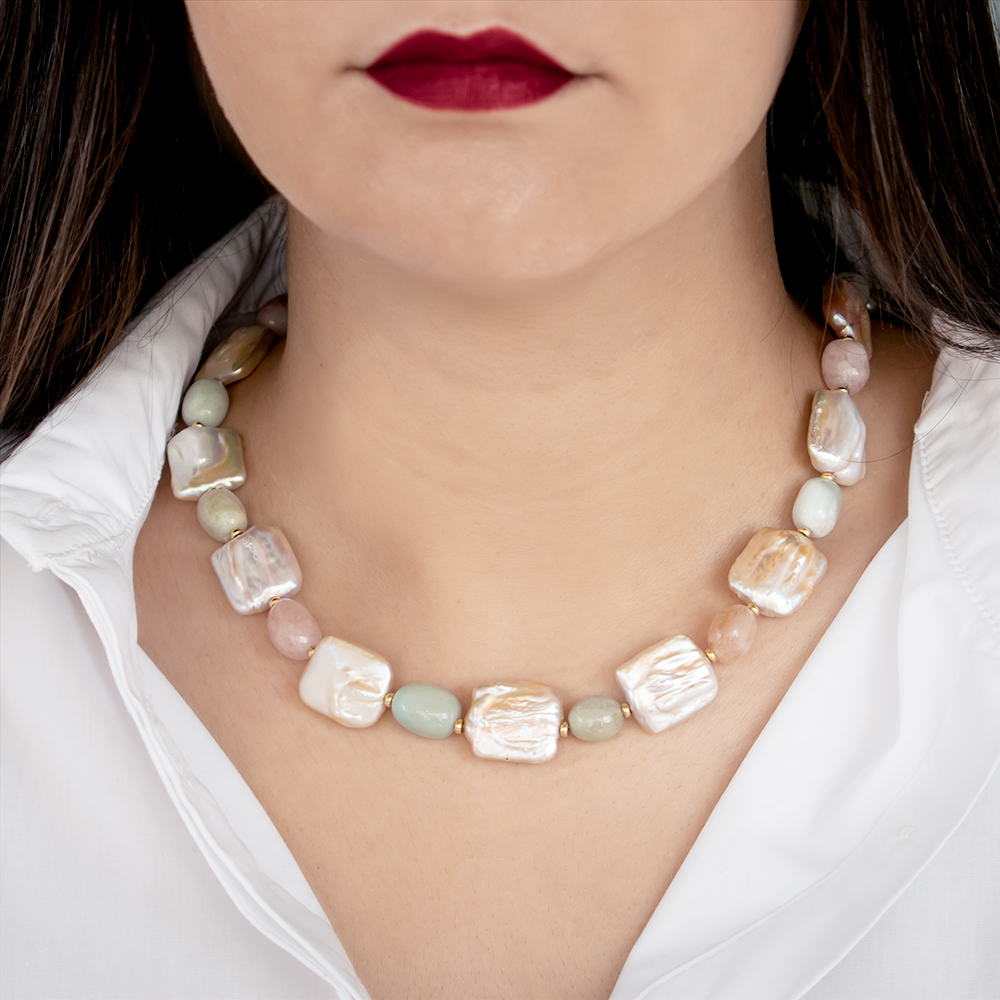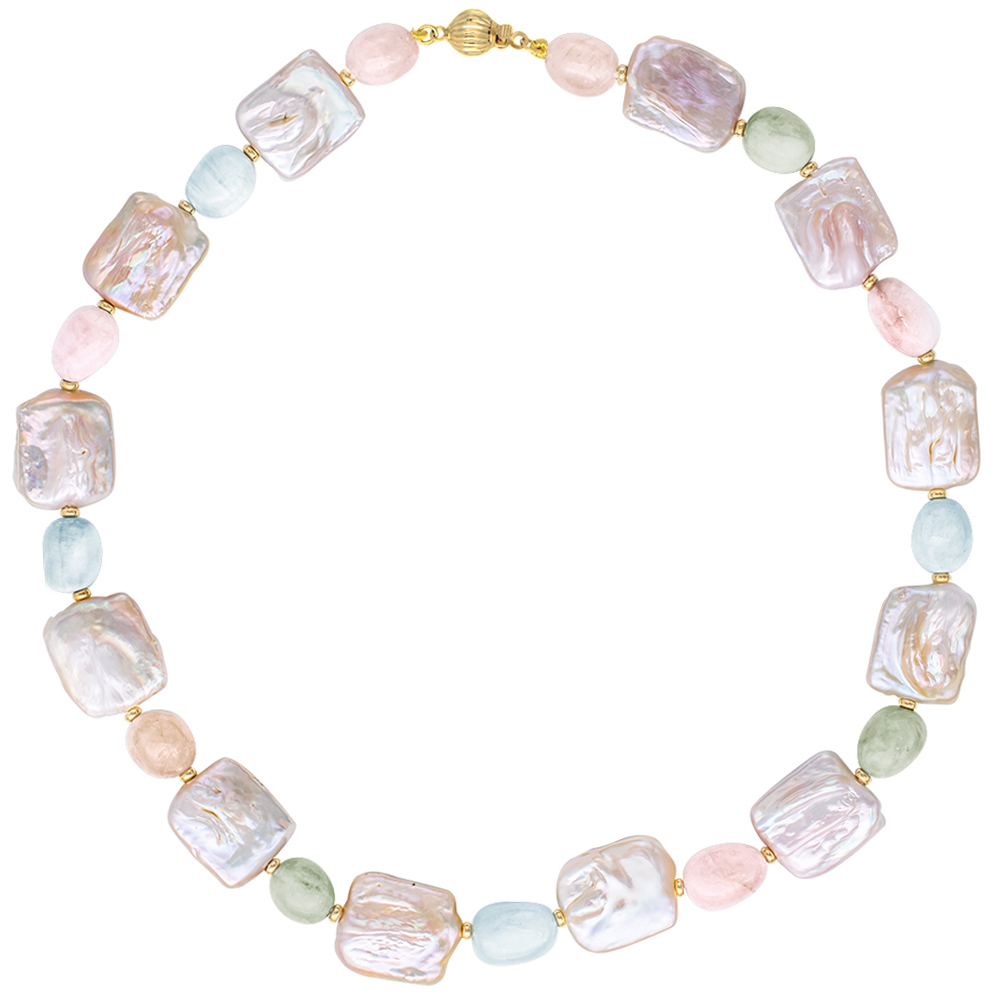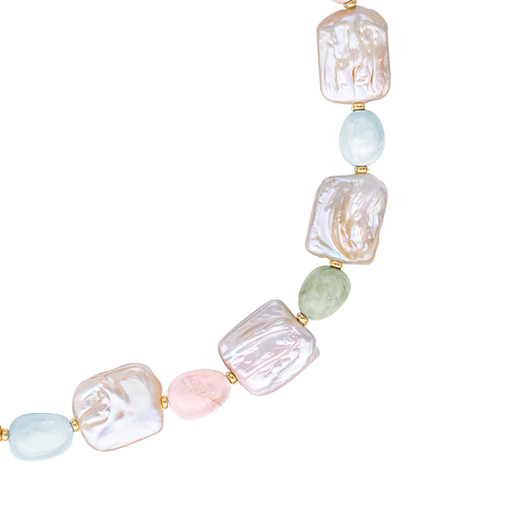 Κολιέ με Κ14 χρυσά στοιχεία, Biwa μαργαριτάρια και multi μοργκανίτη - S124750