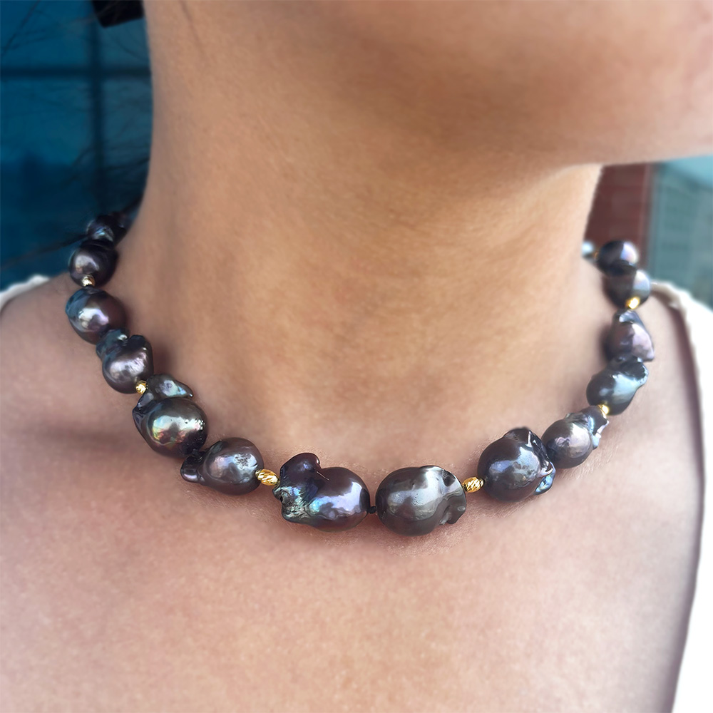 Ένα ιδιαίτερο κολιέ που συνδυάζει τη λάμψη του χρυσού με τα εντυπωσιακά και μεγάλα μαύρα Baroque μαργαριτάρια.