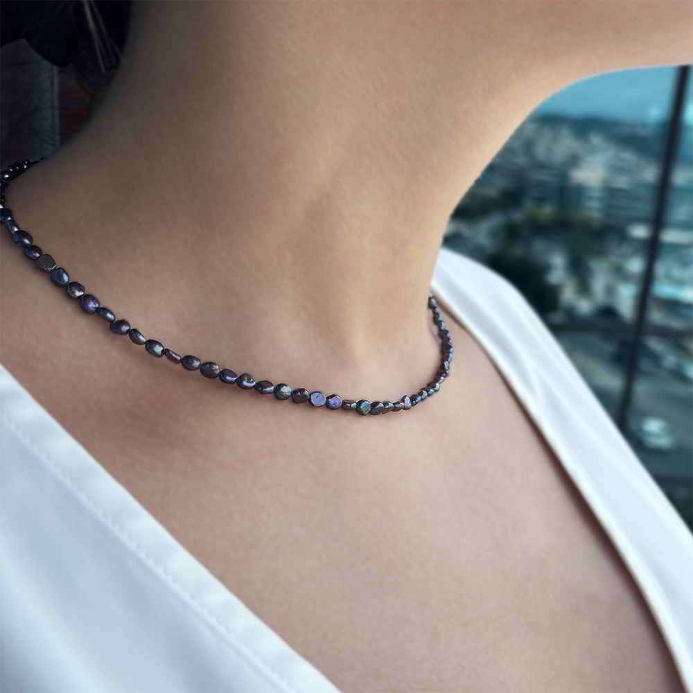 • Ένα υπέροχο κολιέ με μαύρα μαργαριτάρια Fresh Water Pearl διαμέτρου 3,5 χιλιοστών, με ιδιαίτερους ιριδισμούς.