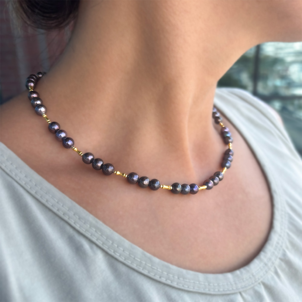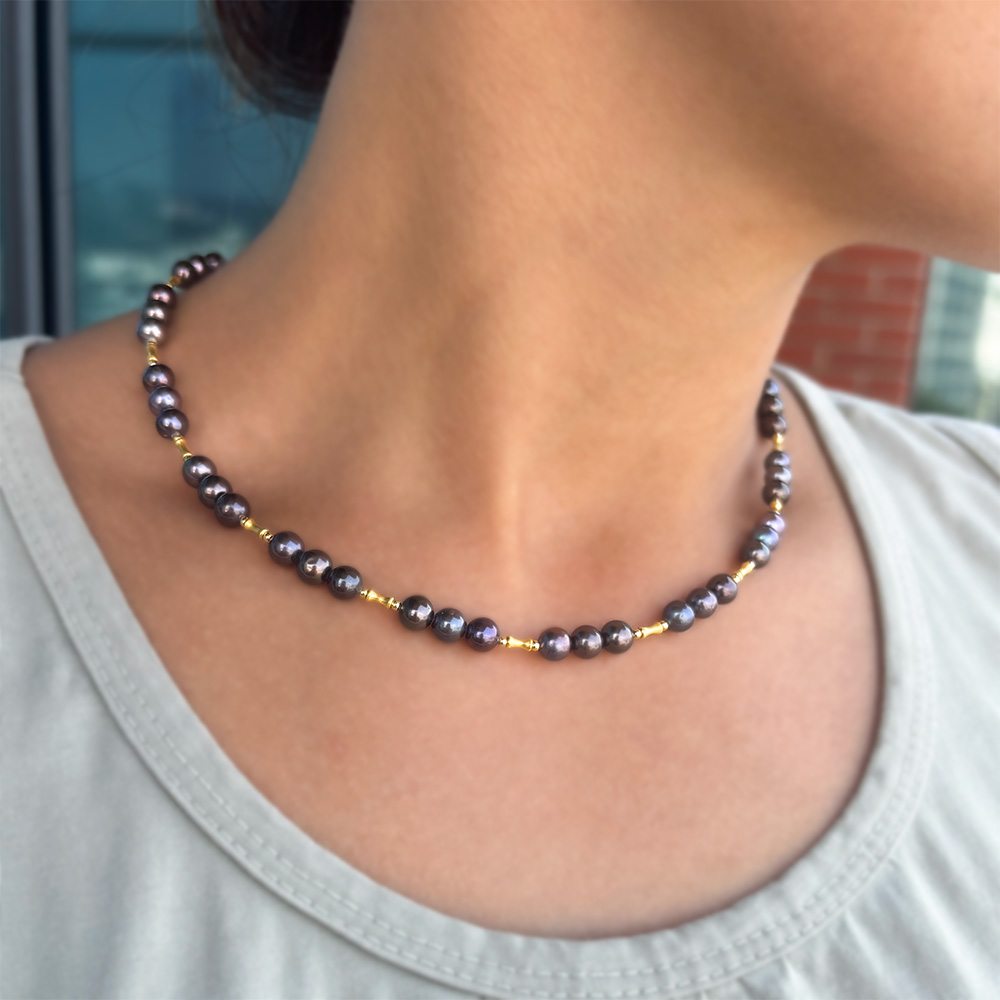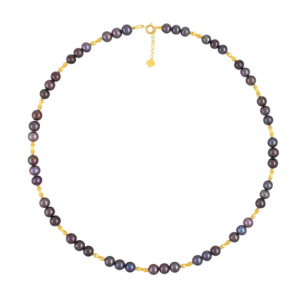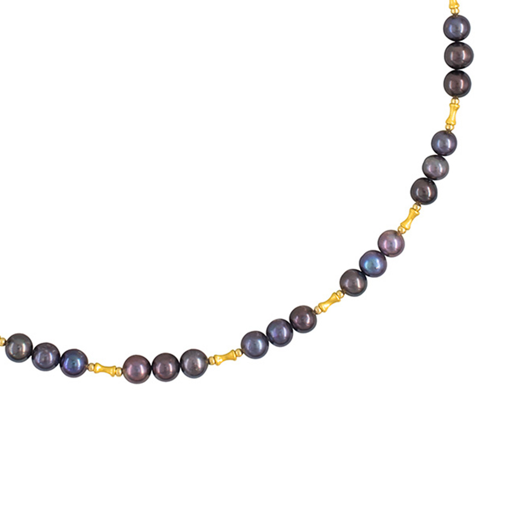 Ένα εντυπωσιακό κολιέ που συνδυάζει την ομορφιά των μαύρων μαργαριταριών με τους ιδιαίτερους ιριδισμούς και τη λάμψη του χρυσού.