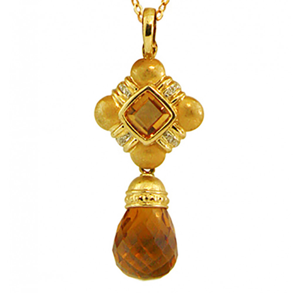 Στο κάτω μέρος του μενταγιόν υπάρχει ένα citrine διάστασης 12x16 χιλιοστών σε χρυσή βάση 14 καρατίων.