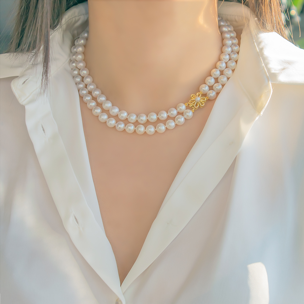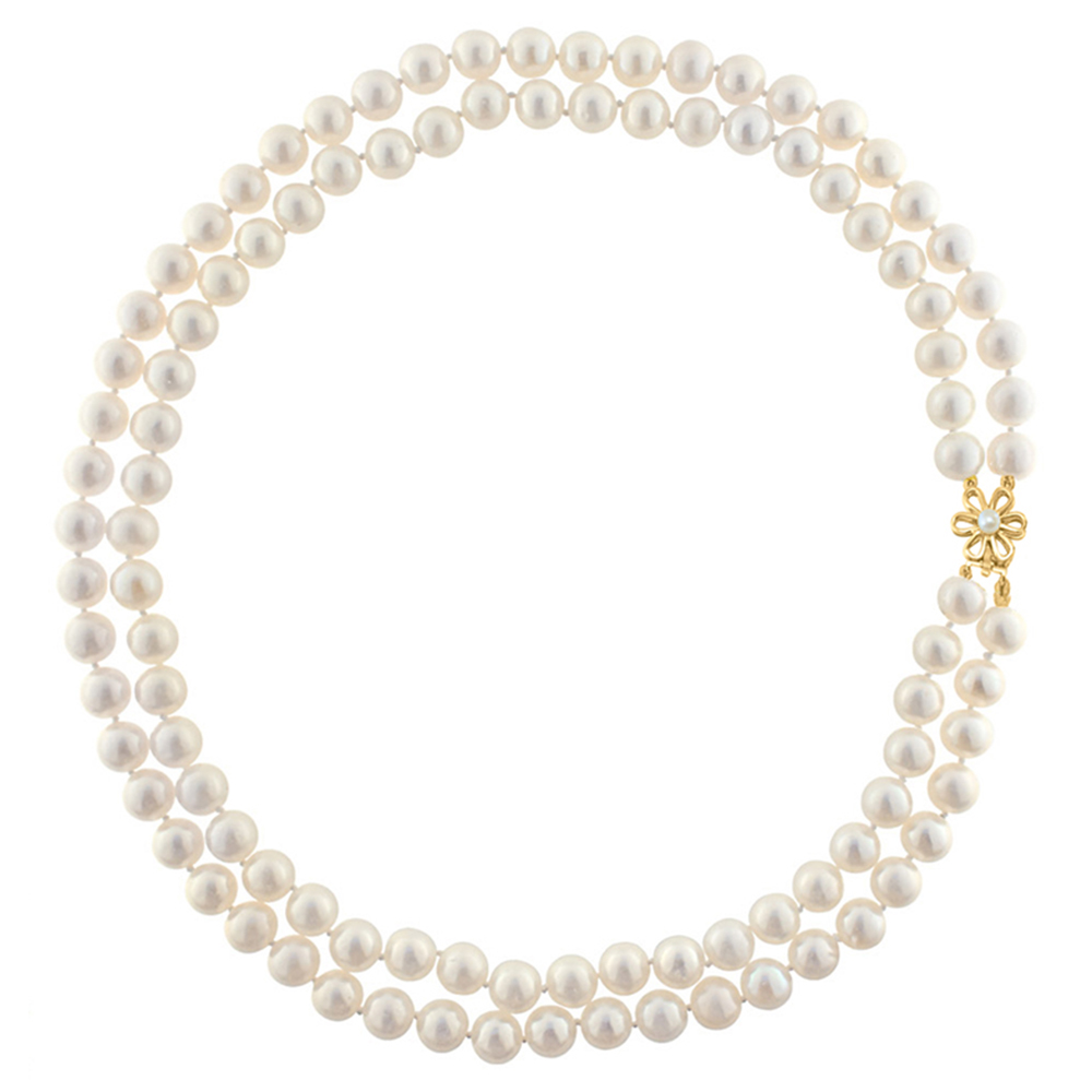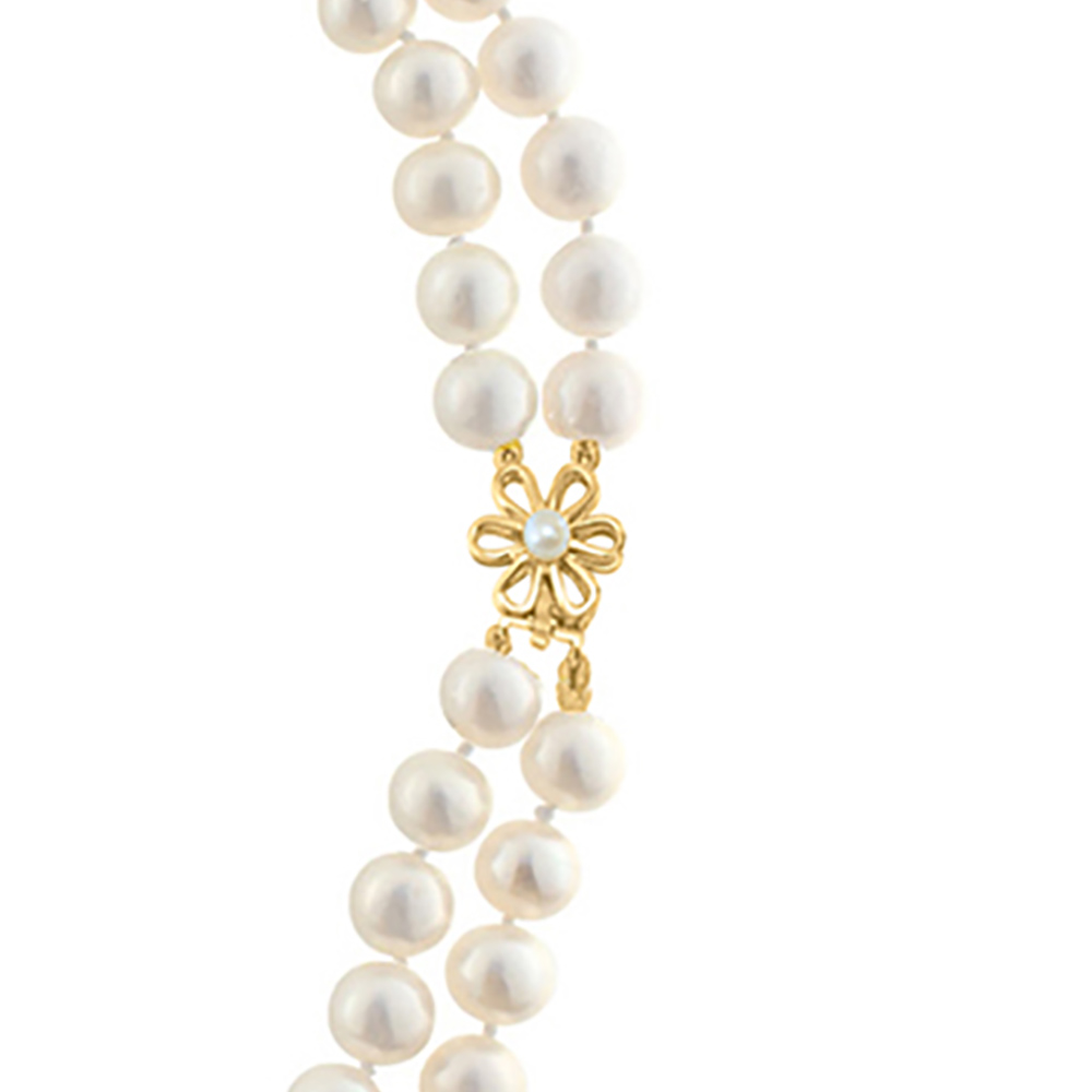 • Ένα υπέροχο κολιέ με 2 σειρές λευκά μαργαριτάρια Fresh Water Pearl διαμέτρου 8 χιλιοστών σε σχήμα Round (στρόγγυλο).