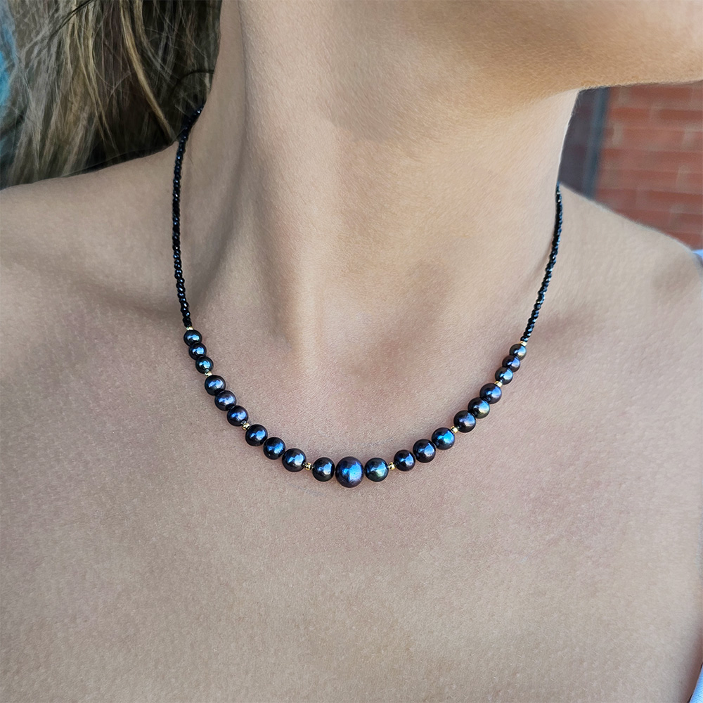 Το κολιέ εντυπωσιάζει με το σχέδιό του καθώς στο κέντρο του υπάρχουν 21 μαύρα μαργαριτάρια Fresh Water Pearl διαμέτρου 5-8 χιλιοστών.
