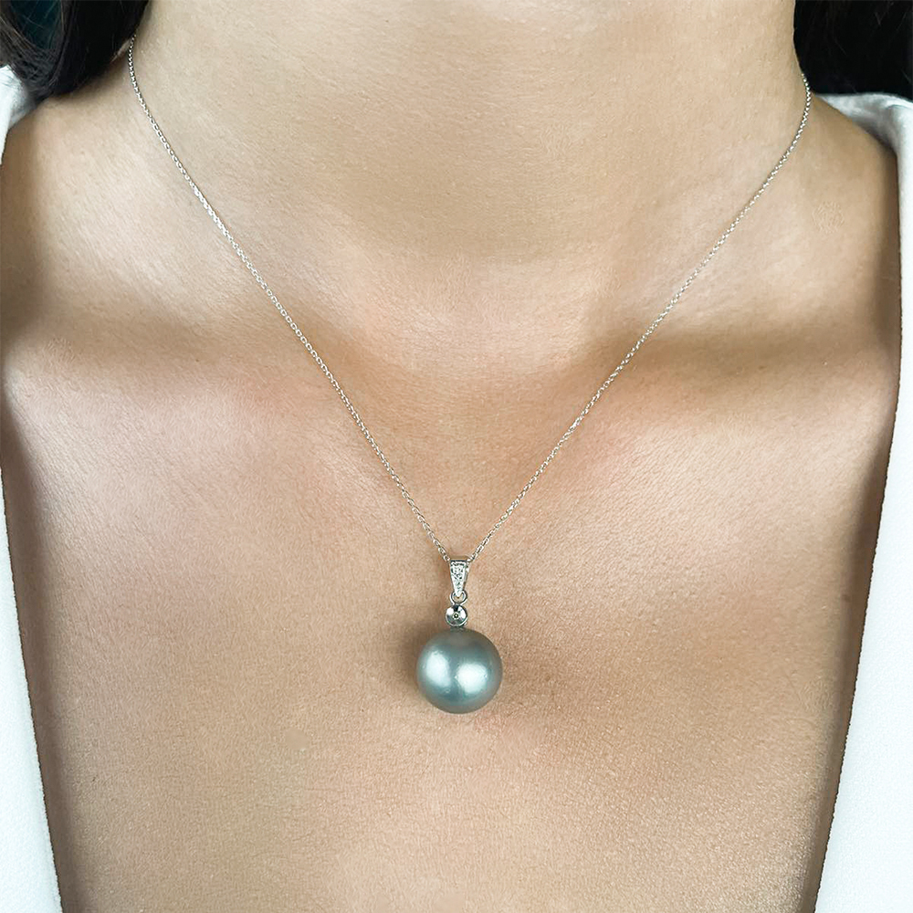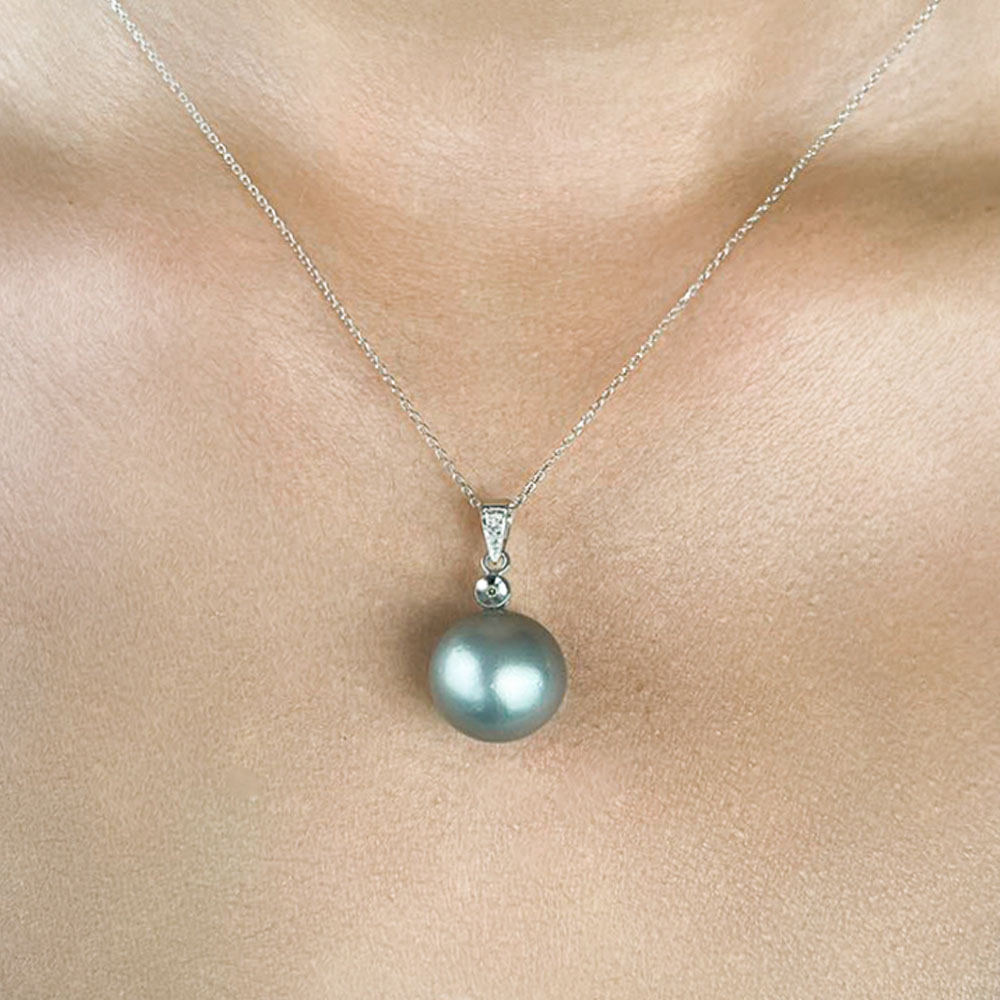 • Ένα μοναδικό κολιέ με χρυσή ή λευκόχρυση αλυσίδα 18 καρατιών και ένα υπέροχο, σπάνιο γκρι μαργαριτάρι South Sea Tahiti άριστης ποιότητας, διαμέτρου 12,3 χιλιοστών.