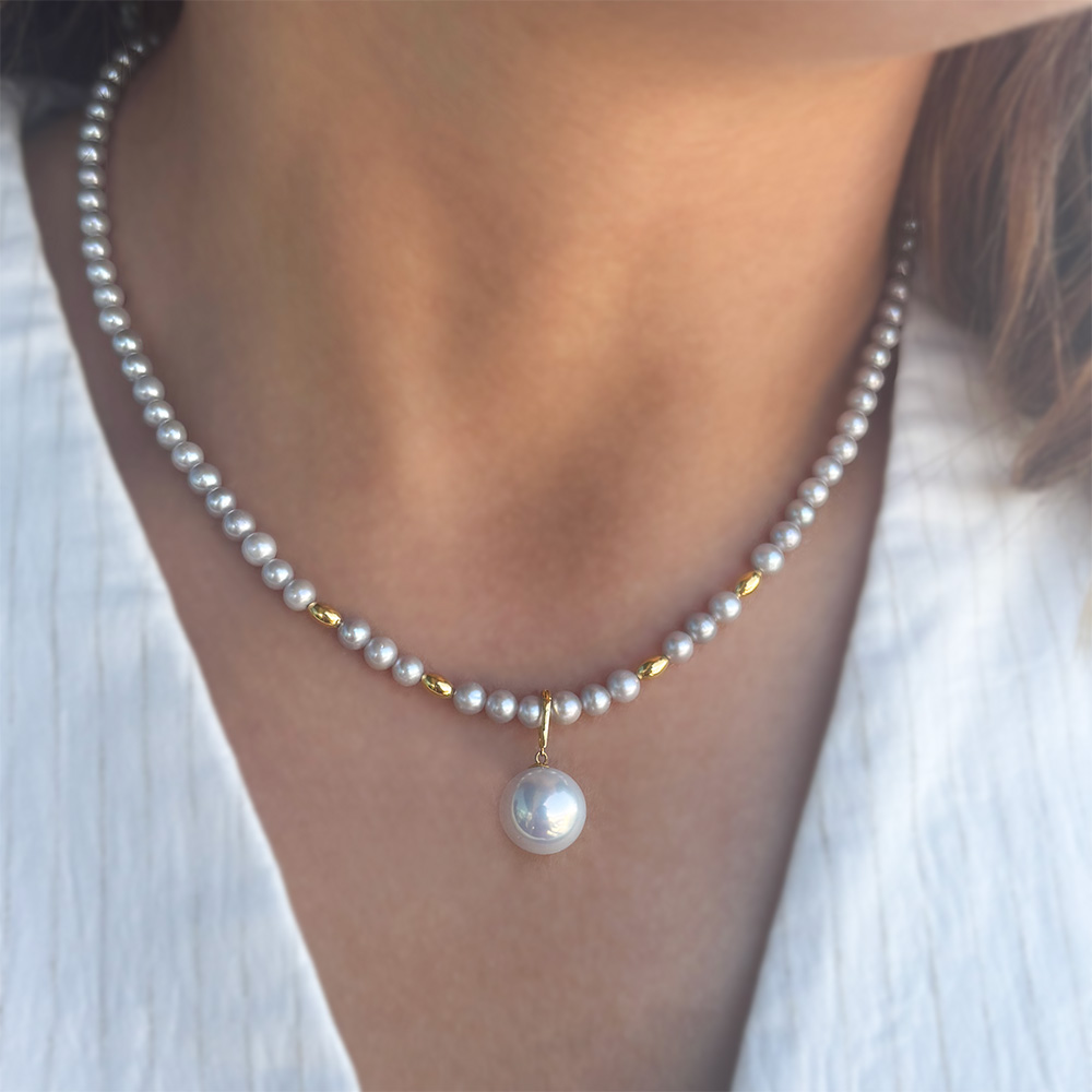 Κολιέ με Κ18 χρυσά στοιχεία, γκρι μαργαριτάρια και μενταγιόν Κ18 με QTV μαργαριτάρι - F126673