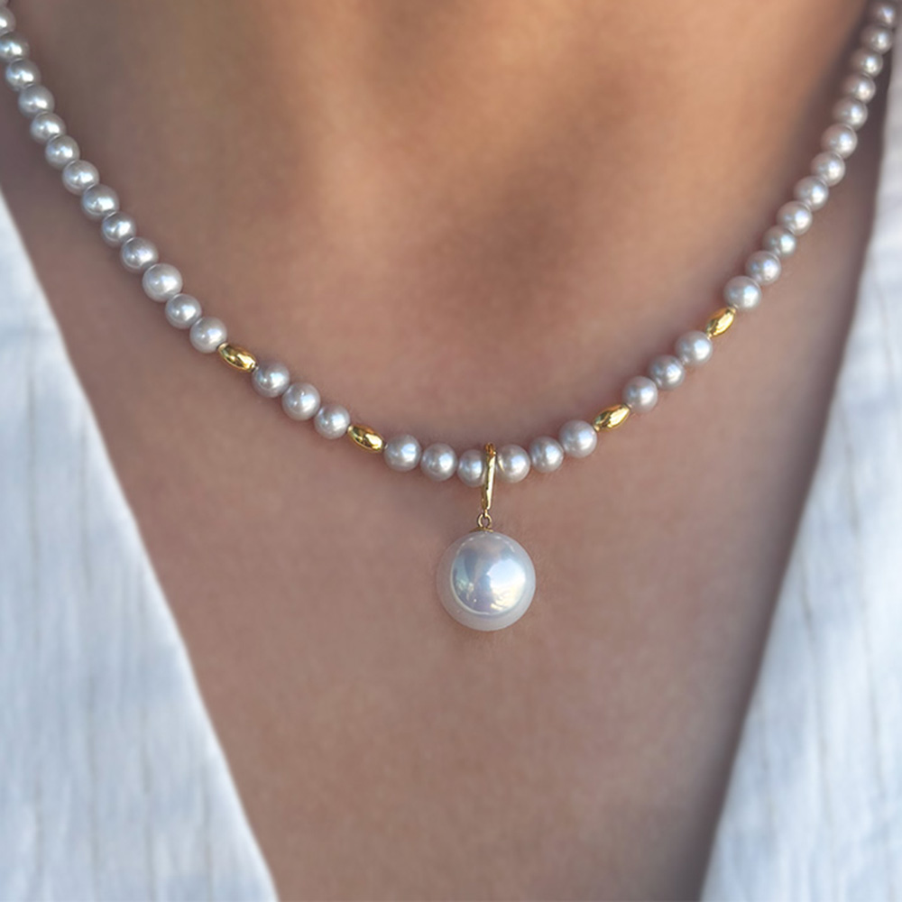 Το κολιέ εντυπωσιάζει με το σχέδιό του καθώς στο κέντρο του υπάρχει ένα μενταγιόν χρυσό 18 καρατίων στο οποίο υπάρχει ένα σπάνιο μαργαριτάρι Q.T.V. Akoya διαμέτρου 11 χιλιοστών σε ένα ιδιαίτερο χρώμα grey- blue.