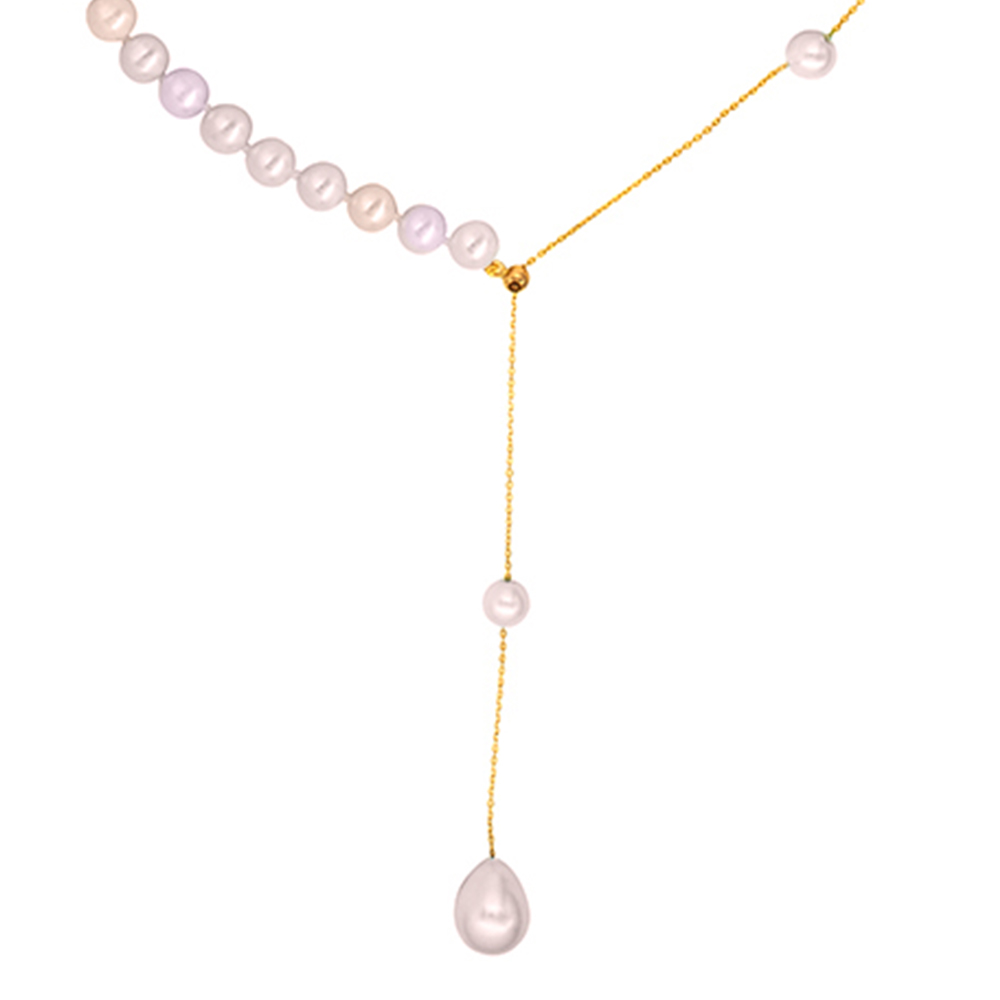 Το κολιέ ξεχωρίζει με το ιδιαίτερό του σχέδιο, που συνδυάζει το κλασσικό, διαχρονικό μαργαριταρένιο κολιέ, με χρυσή αλυσίδα 14 καρατιών.