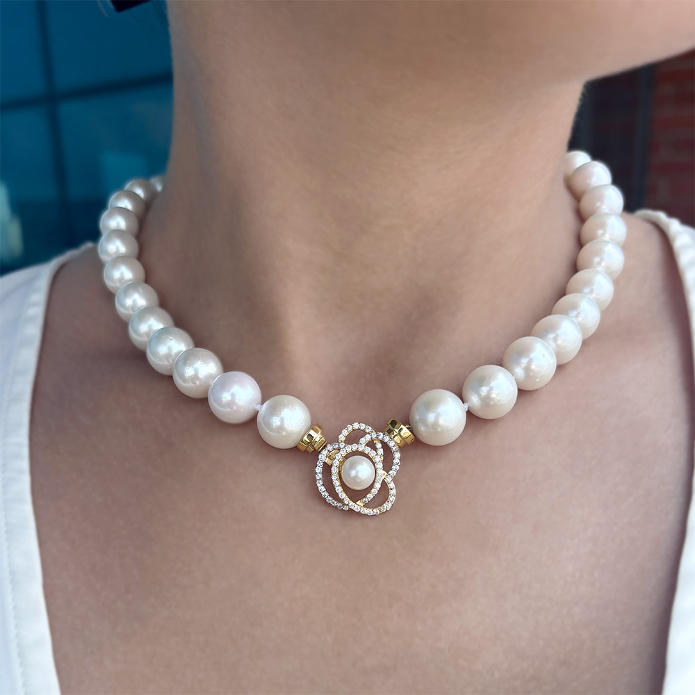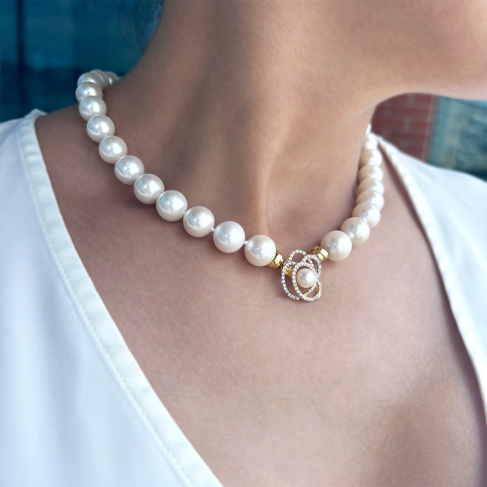 • Ένα υντυπωσιακό και μοναδικό κολιέ με λευκά στρόγγυλα μαργαριτάρια Fresh Water Pearl διαμέτρου 12-13 χιλιοστών.