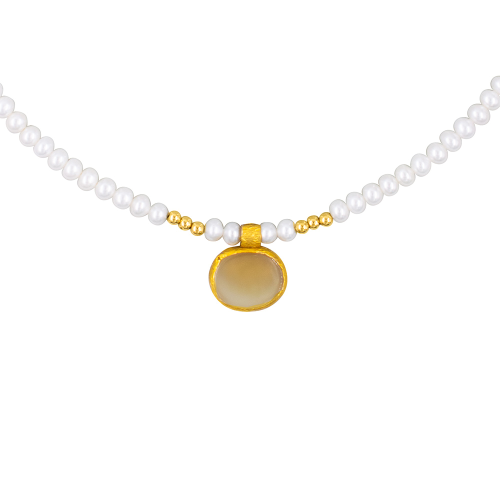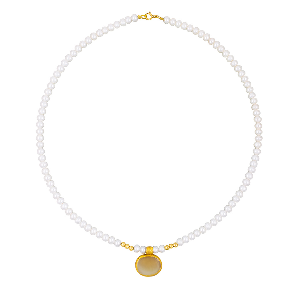 Κολιέ με Κ14 χρυσό μενταγιόν με αχάτη και λευκά μαργαριτάρια - F124768A