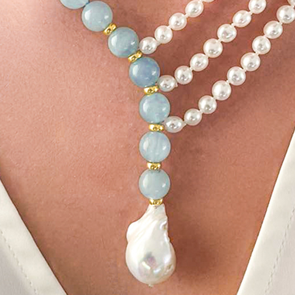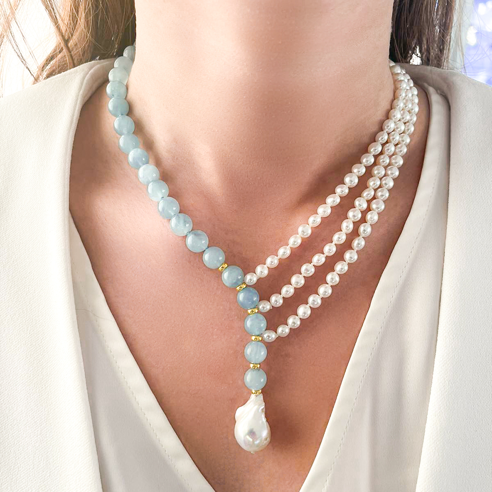 • Ένα υπέροχο κολιέ που συνδυάζει μαργαριτάρια με ημιπολύτιμους λίθους Αqua διαμέτρου 8 x 8,5  χιλιοστών.