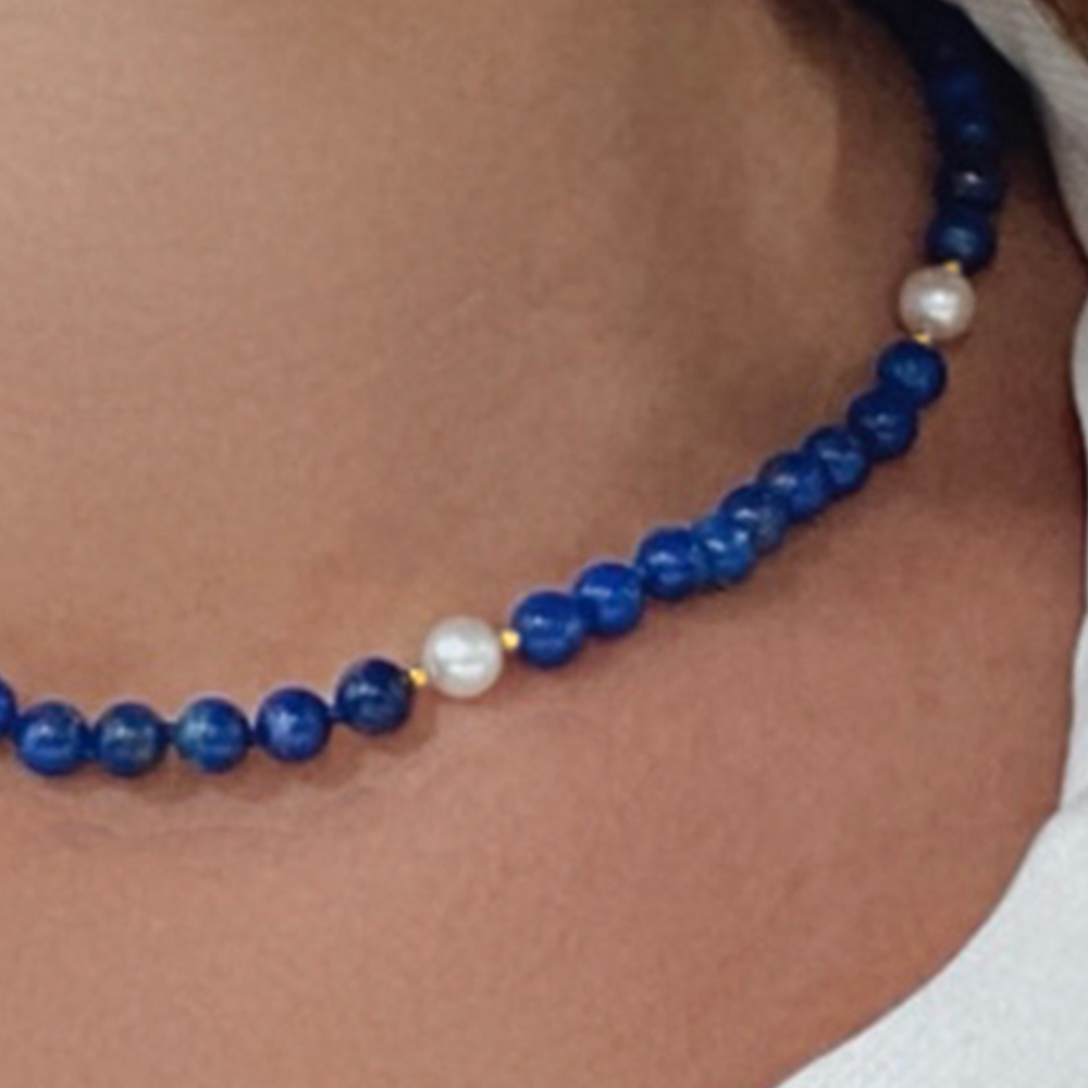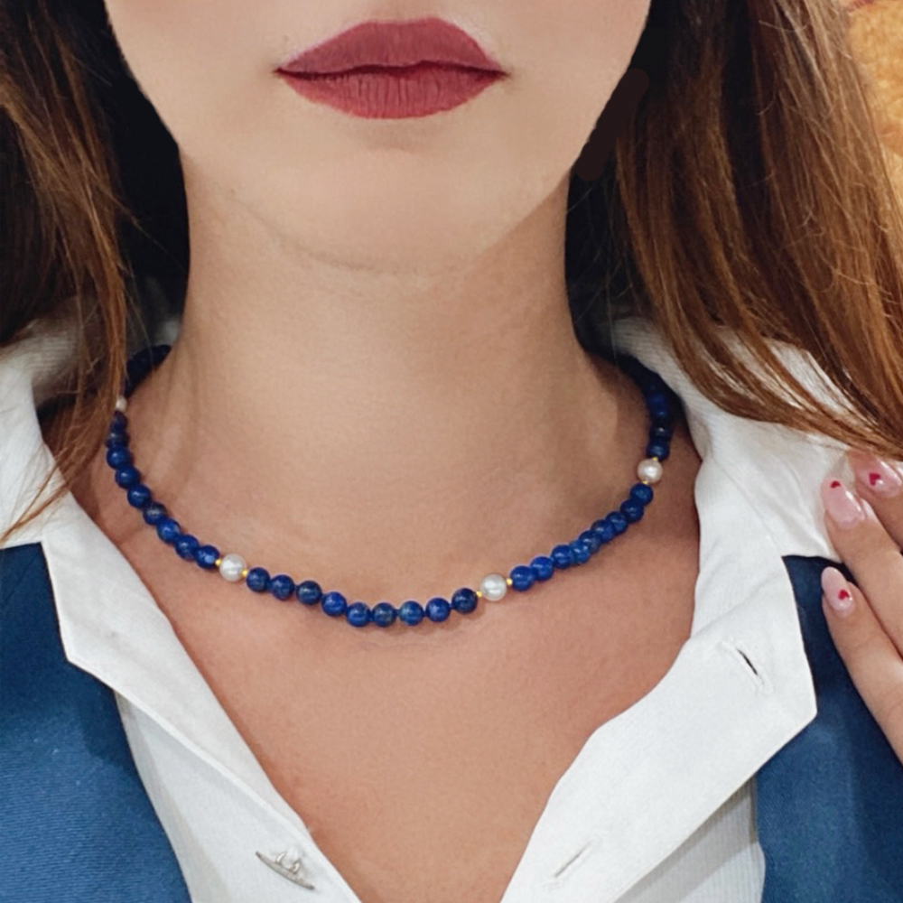 • Ένα υπέροχο κολιέ από ημιπολύτιμους λίθους λάπις λάζουλι διαμέτρου 6 χιλιοστών.