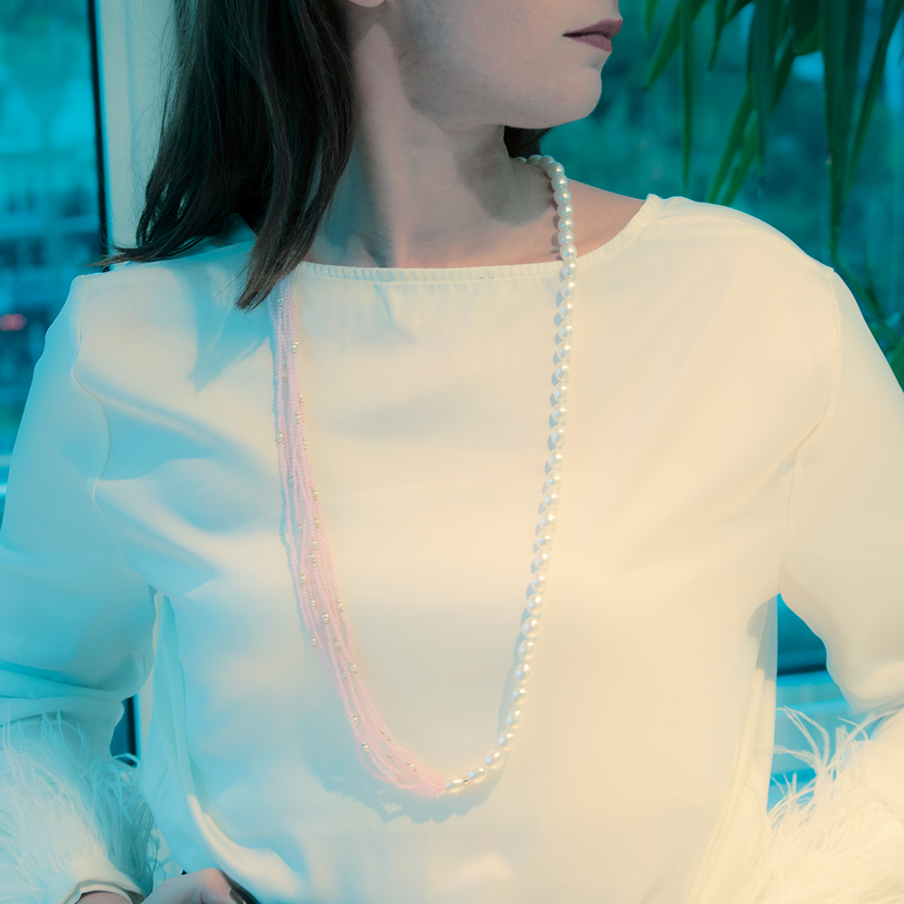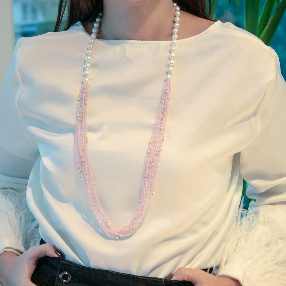 Αποτελείται κατά το ήμισυ απόσειρές από pink quartz διαμέτρου 2 χιλιοστών με 63 μαργαριτάρια Fresh Water Pearl διαμέτρου 2,5 - 3 χιλιοστών και 126 χρυσά στοιχεία 14 καρατιών , Το κολιέ εντυπωσιάζει με το σχέδιό του, οπότε μπορεί να φορεθεί με δύο όψεις.