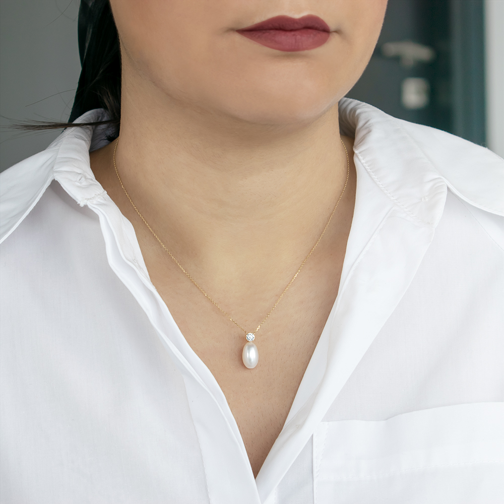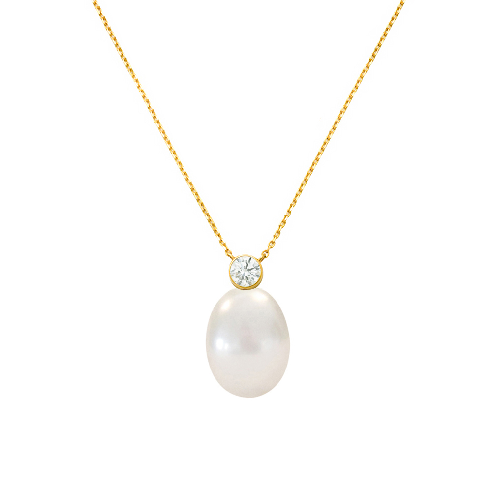 Κολιέ με Κ14 χρυσή αλυσίδα, λευκό μαργαριτάρι και ζιργκόν - F124570L