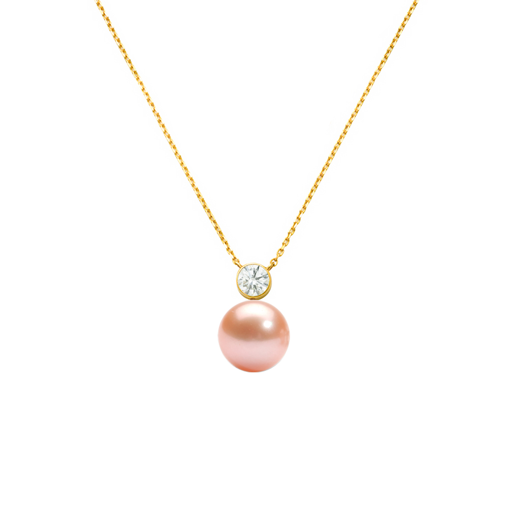 Κολιέ με Κ14 χρυσή αλυσίδα, σομόν μαργαριτάρι Q.T.V. Akoya και ζιργκόν - F124570S