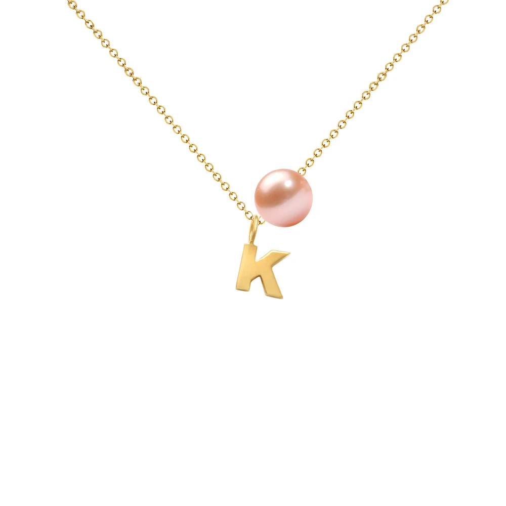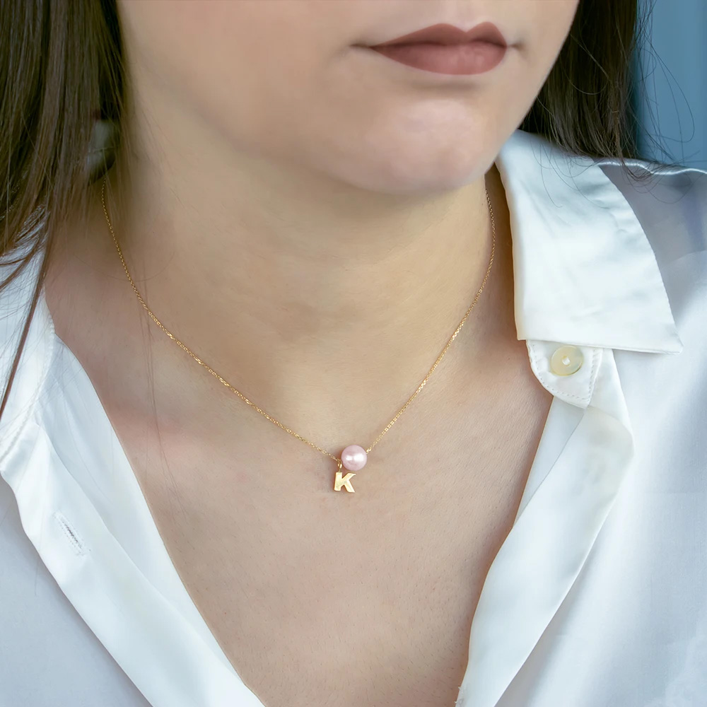 Μαζί με το μονόγραμμα στην χρυσή αλυσίδα υπάρχει και ένα somon μαργαριτάρι Fresh Water Pearl διαμέτρου 7,5 - 8 χιλιοστών σε σχήμα στρογγυλό, άριστης ποιότητας.