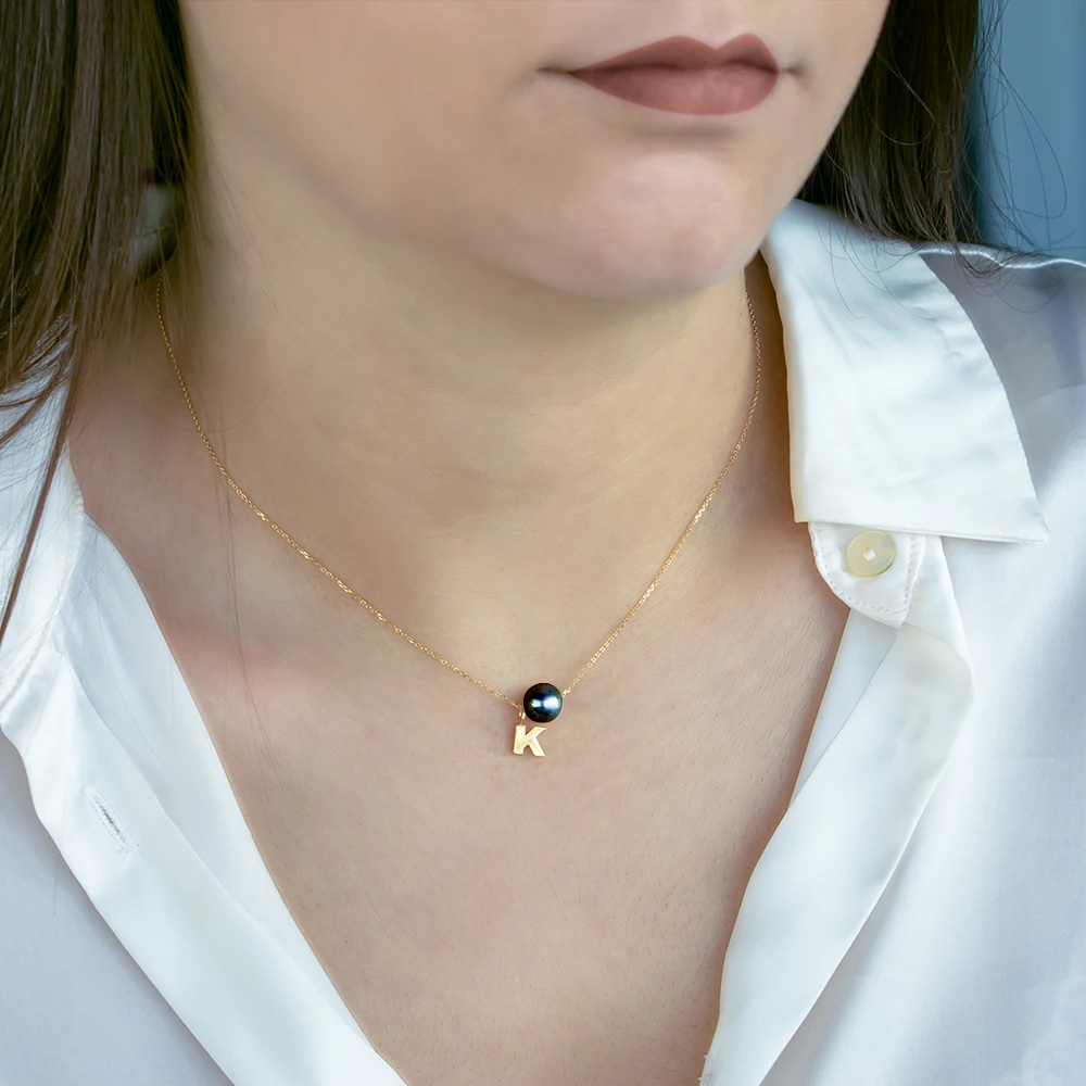 Μαζί με το μονόγραμμα στην χρυσή αλυσίδα υπάρχει και ένα μαύρο μαργαριτάρι Fresh Water Pearl διαμέτρου 7,5 - 8 χιλιοστών σε σχήμα στρογγυλό, άριστης ποιότητας.