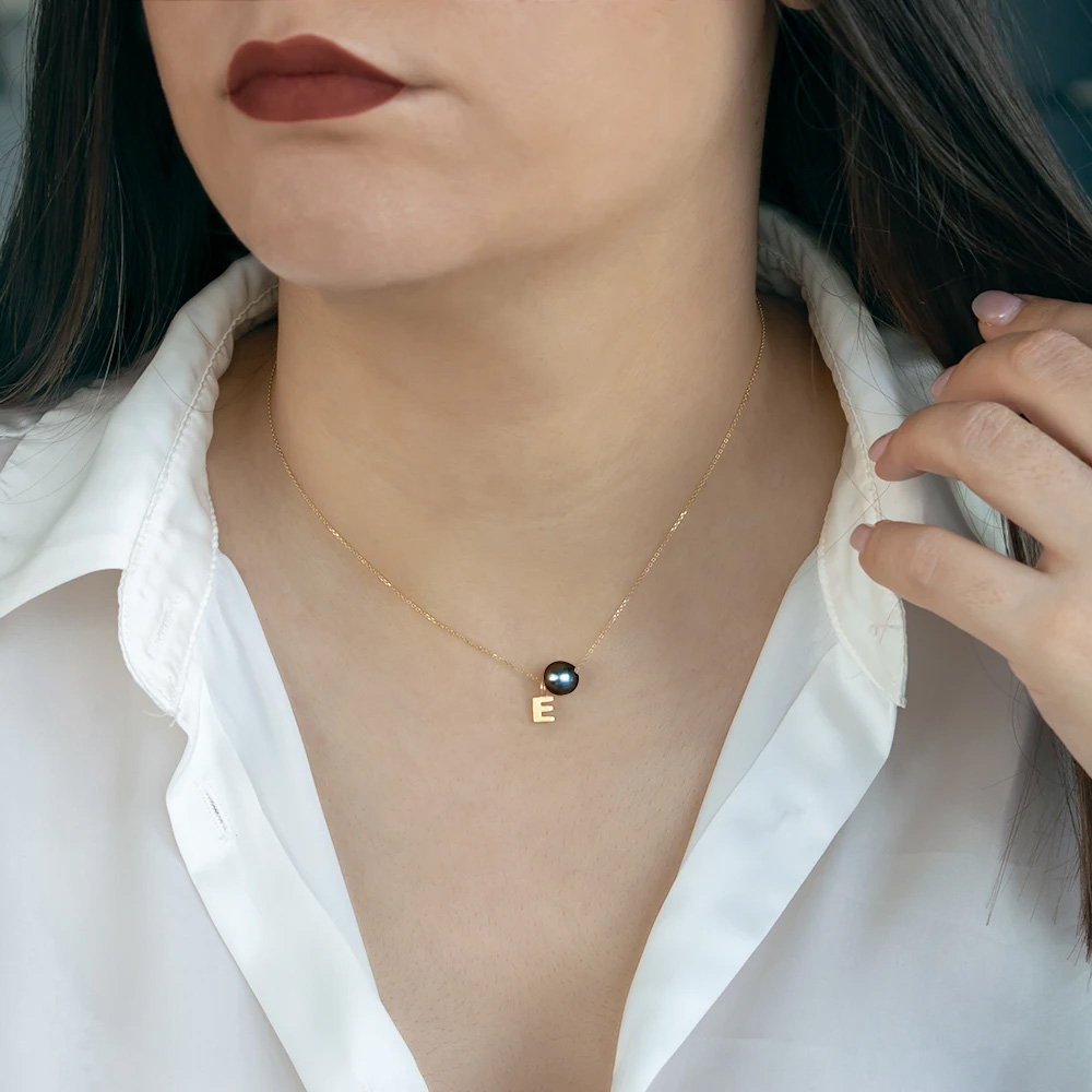 Μαζί με το μονόγραμμα στην χρυσή αλυσίδα υπάρχει και ένα μαύρο μαργαριτάρι Fresh Water Pearl διαμέτρου 7,5 - 8 χιλιοστών σε σχήμα στρογγυλό, άριστης ποιότητας.
