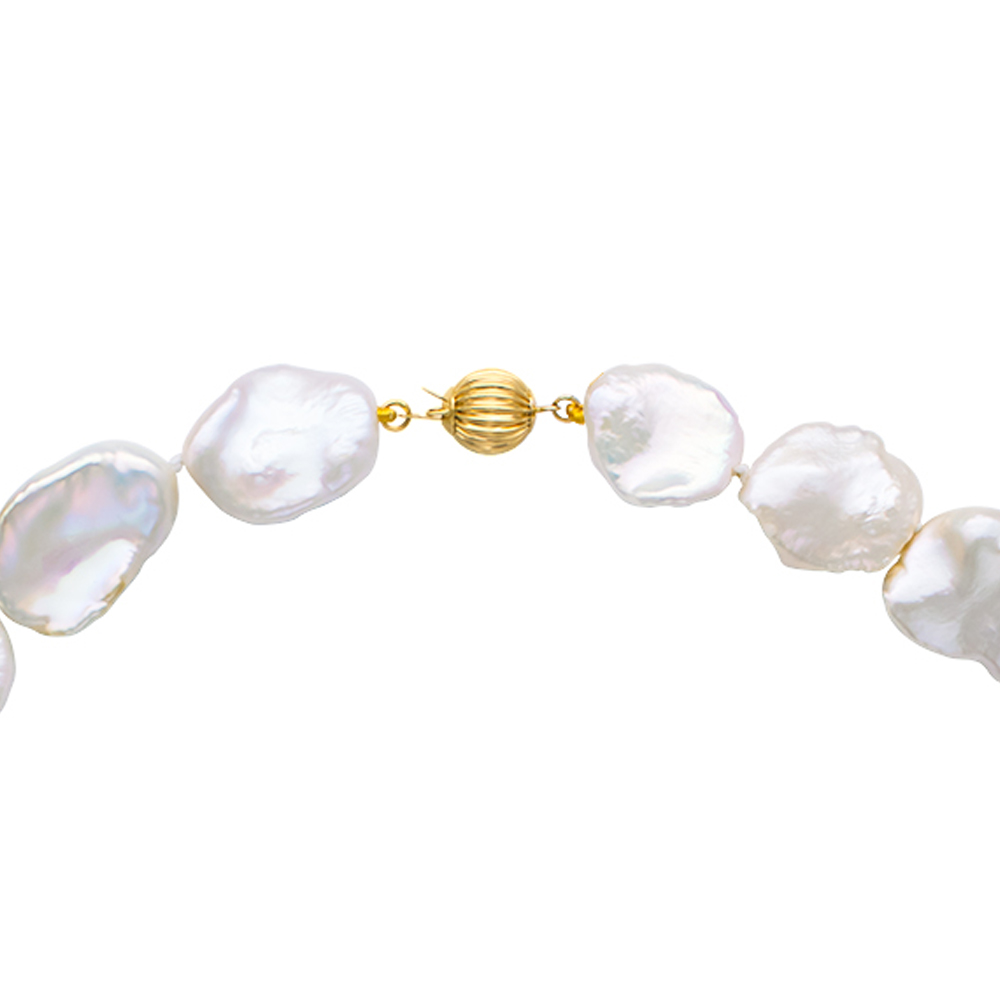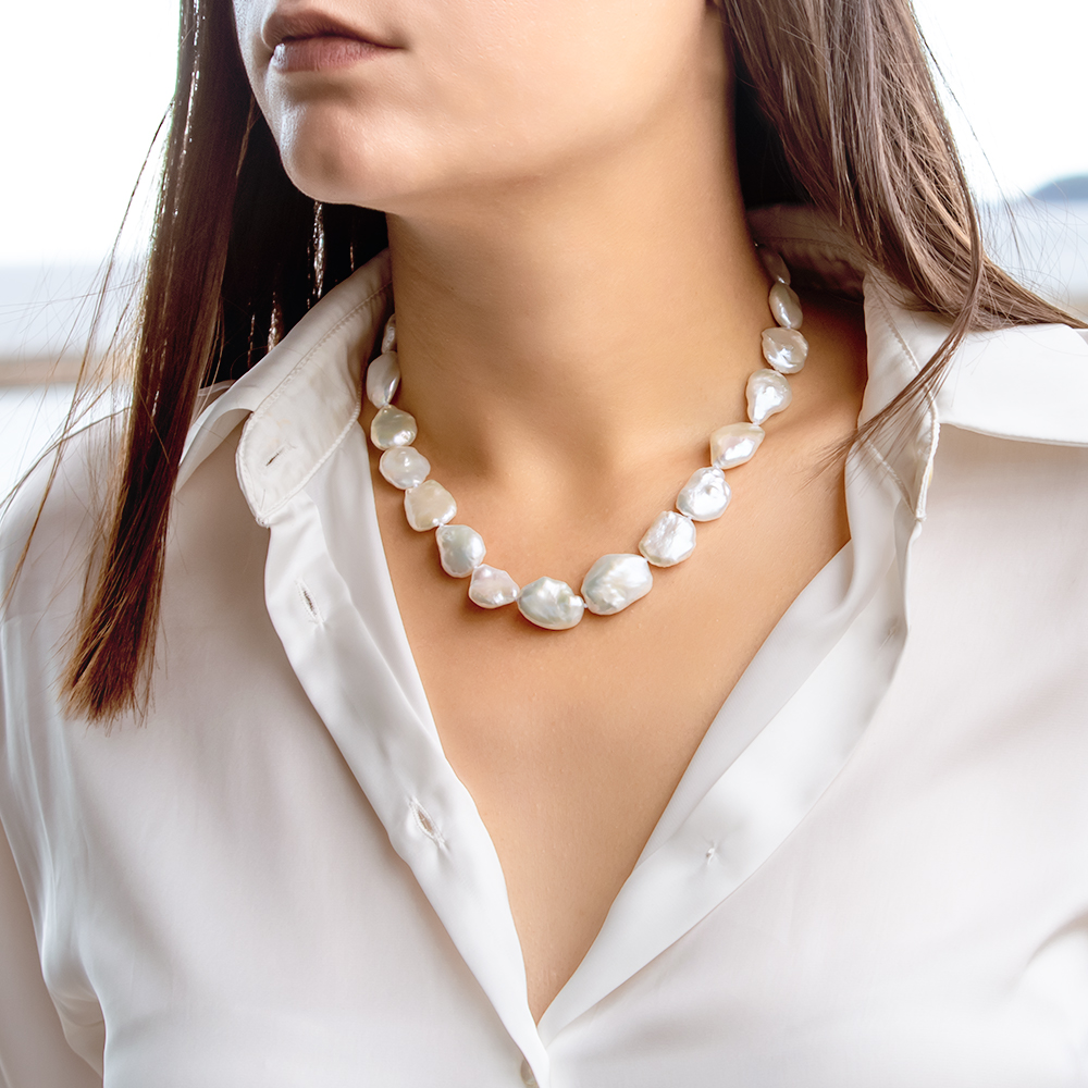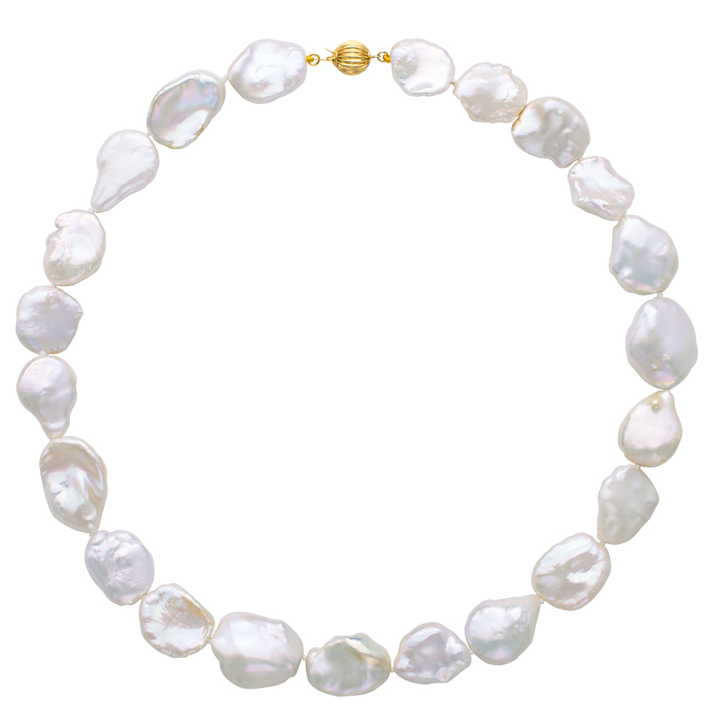 • Ένα υπέροχο και μοναδικό κολιέ με φυσικά ακανόνιστα λευκά μαργαριτάρια Biwa Fresh Water Pearl διαμέτρου 15x18 χιλιοστών σε σχήμα Baroque.