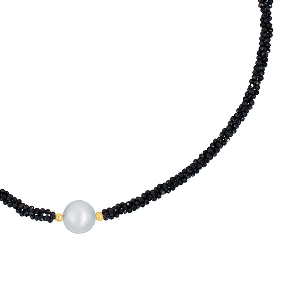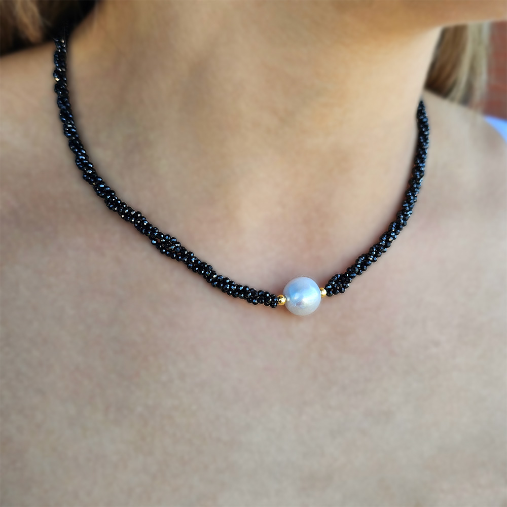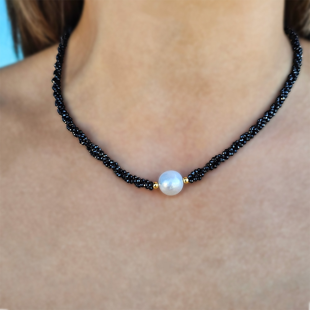 Το κολιέ εντυπωσιάζει με το σχέδιό του καθώς στο κέντρο του υπάρχει ένα στρόγγυλο γκρι μαργαριτάρι Fresh Water Pearl διαμέτρου 11 χιλιοστών.