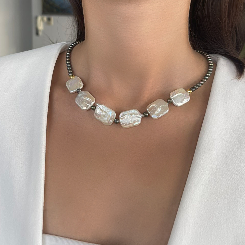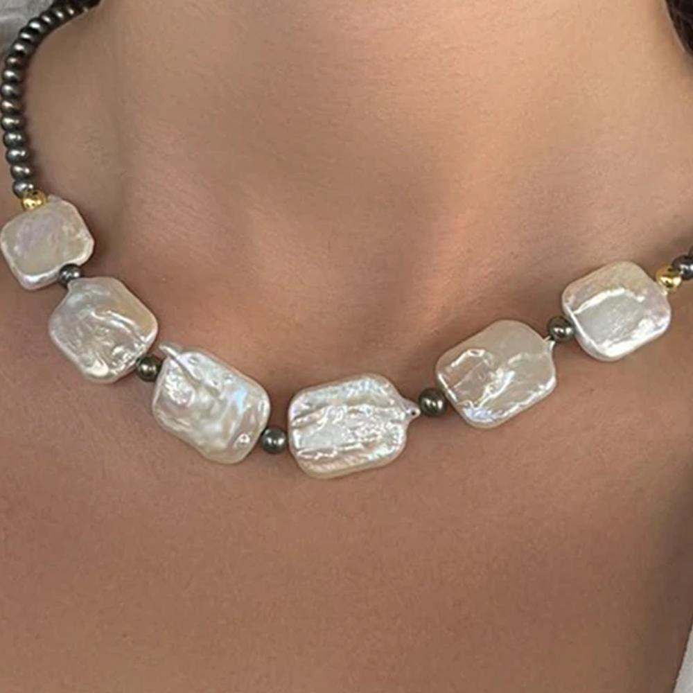 Το κολιέ εντυπωσιάζει με το σχέδιό του καθώς συνδυάζονται δυο υπέροχες κατηγορίες μαργαριταριών.
