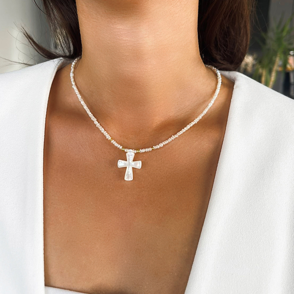 Στη μέση του υπάρχει ένας εντυπωσιακός σταυρός Shell Pearl με διάσταση 18 x 22 χιλιοστών και 4 χρυσά στοιχεία 14 καρατιών.
