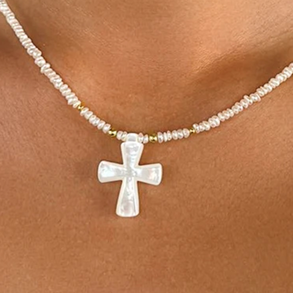 Κολιέ με Κ14 χρυσό κούμπωμα και λευκά μαργαριτάρια και σταυρό - M125206