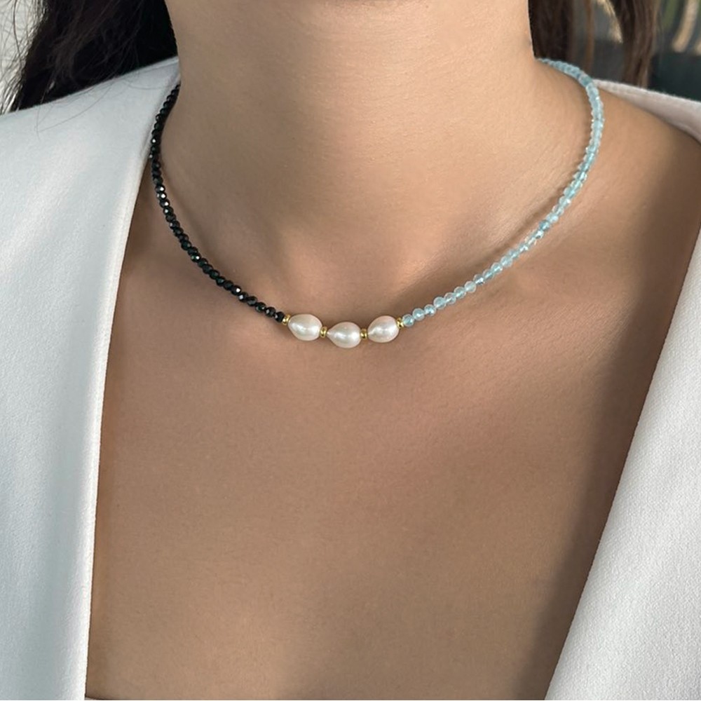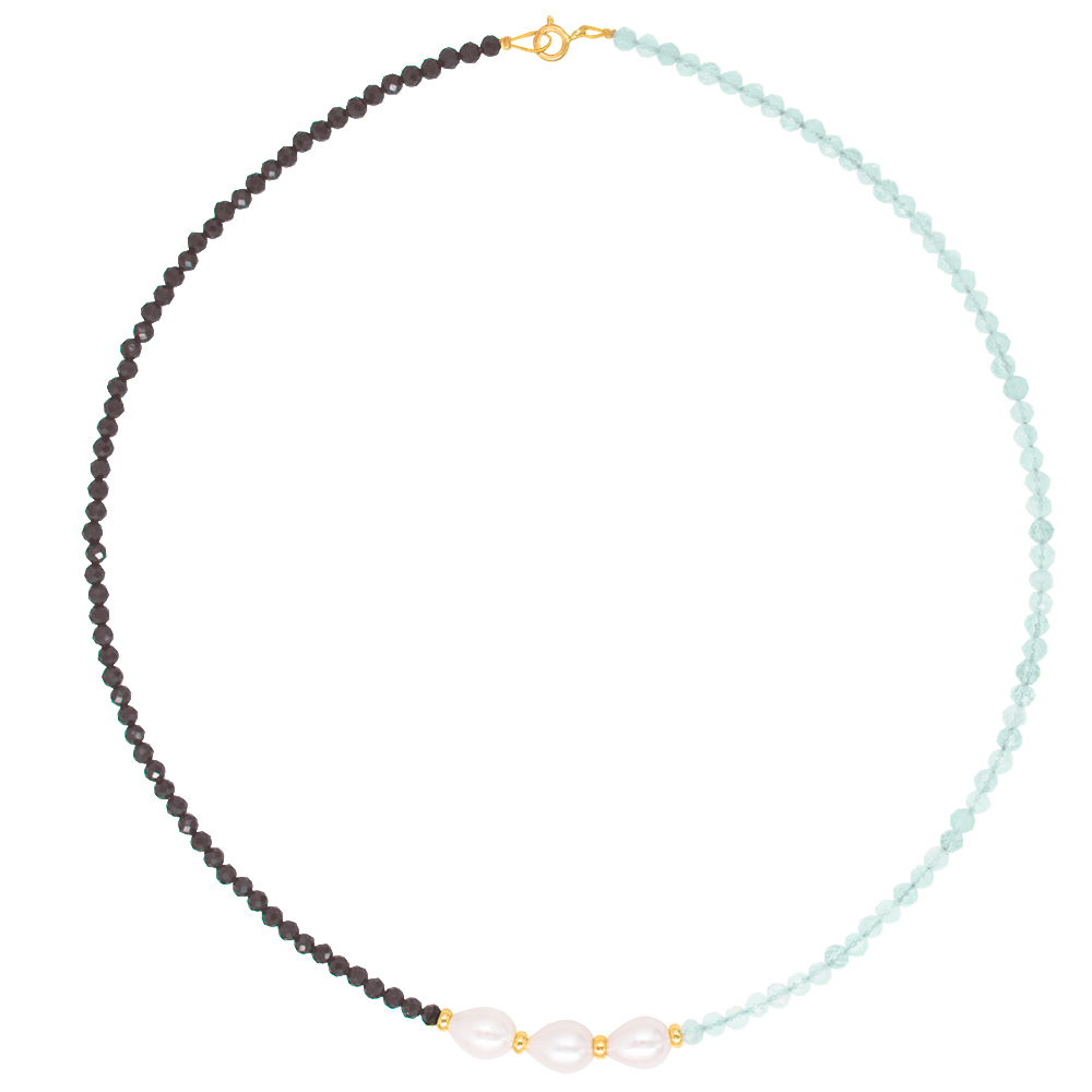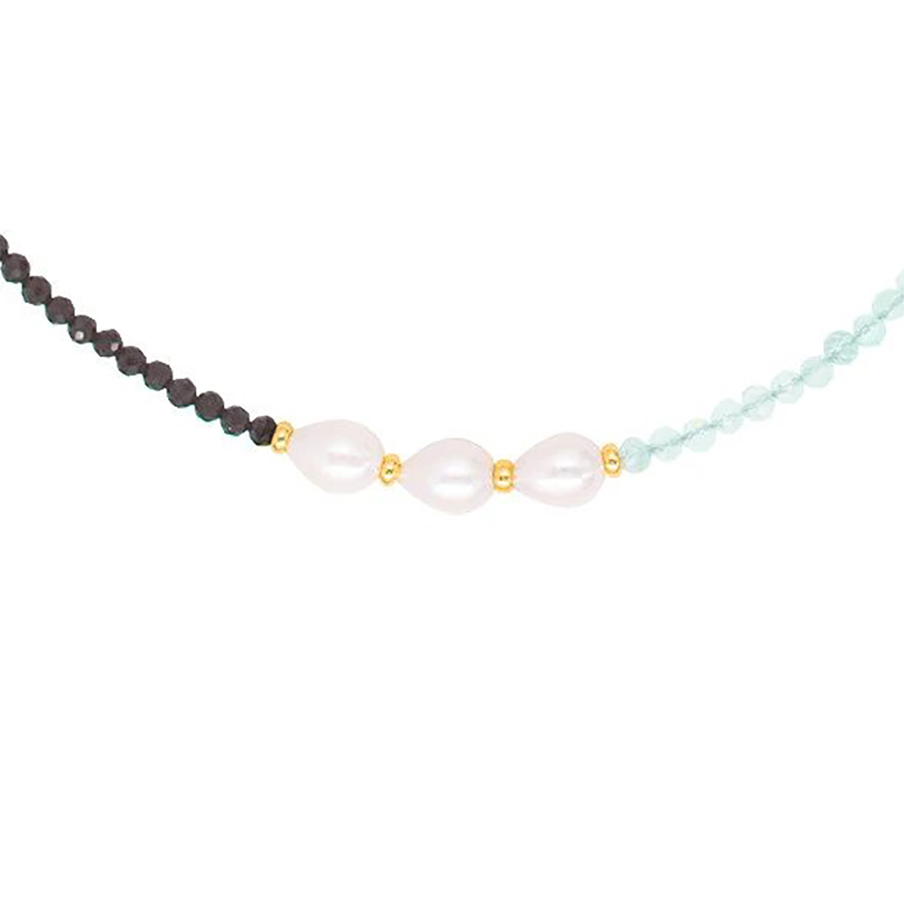 -18% Κολιέ με Κ14 χρυσά στοιχεία, μαργαριτάρια, Spinel και Aqua - F125065