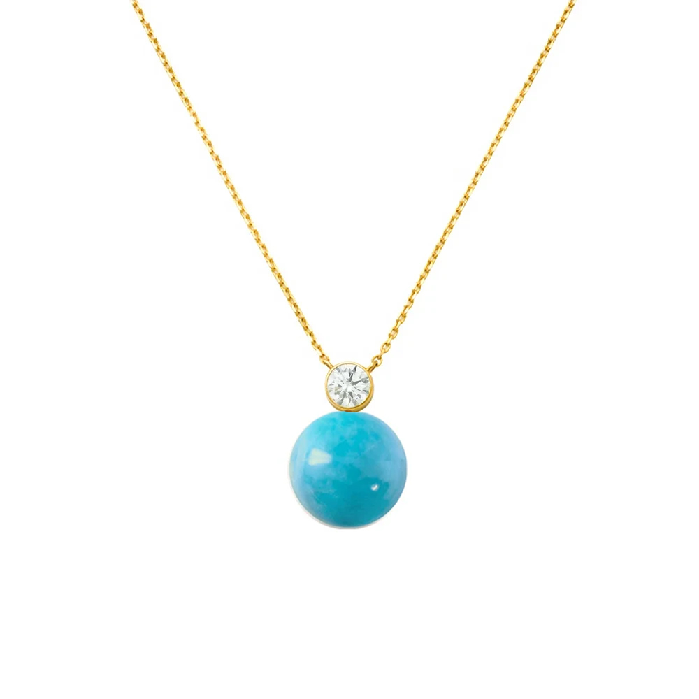 • Ένα υπέροχο κολιέ με χρυσή αλυσίδα 14 καρατιών και Τιρκουάζ διαμέτρου 12 χιλιοστών σε σχήμα στρογγυλό.