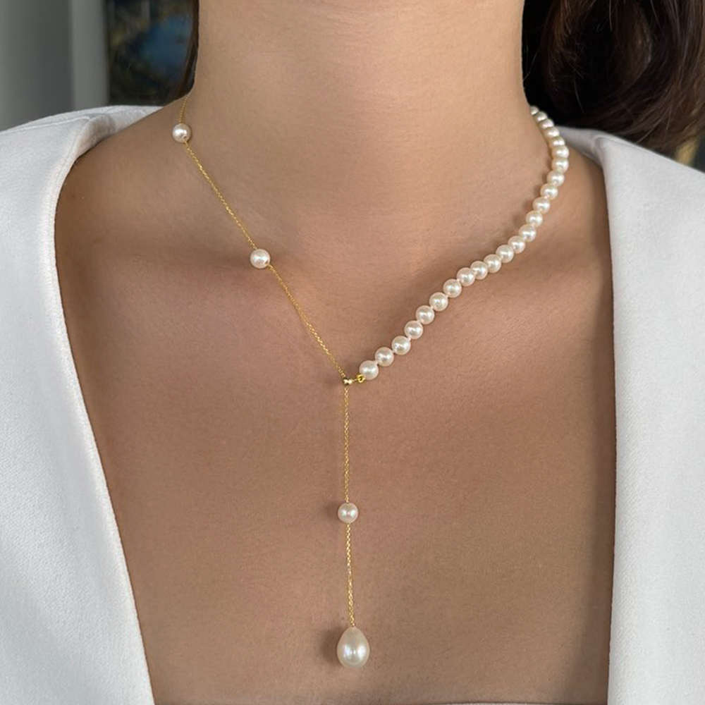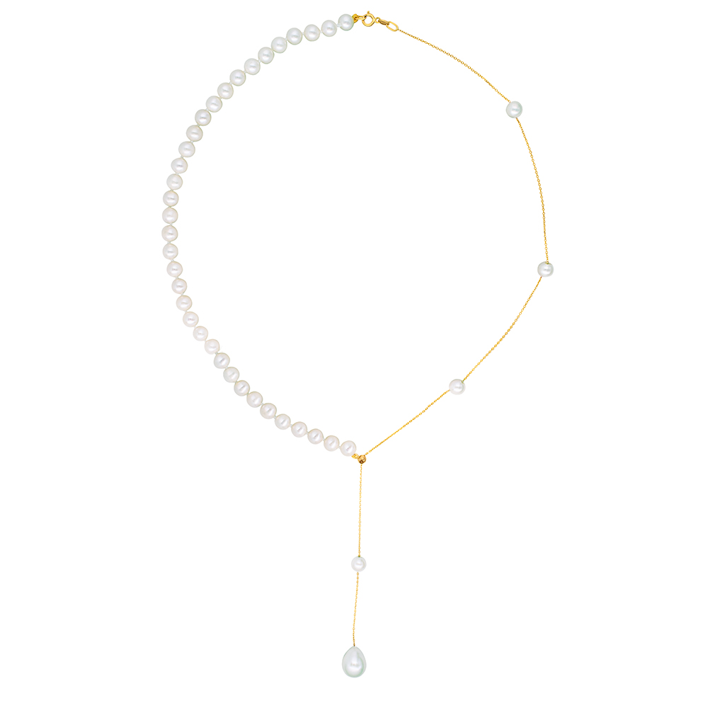 Το κολιέ ξεχωρίζει με το ιδιαίτερό του σχέδιο, που συνδυάζει το κλασσικό, διαχρονικό μαργαριταρένιο κολιέ, με χρυσή αλυσίδα 14 καρατιών.