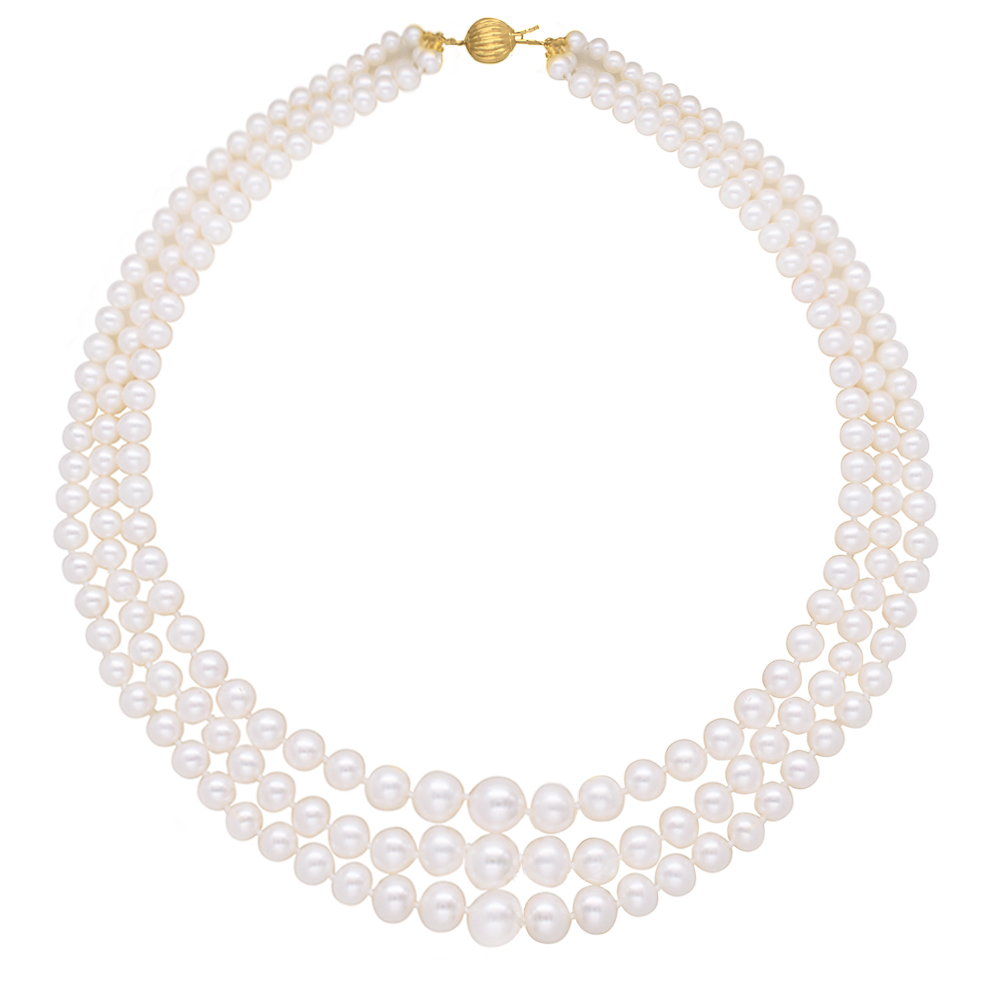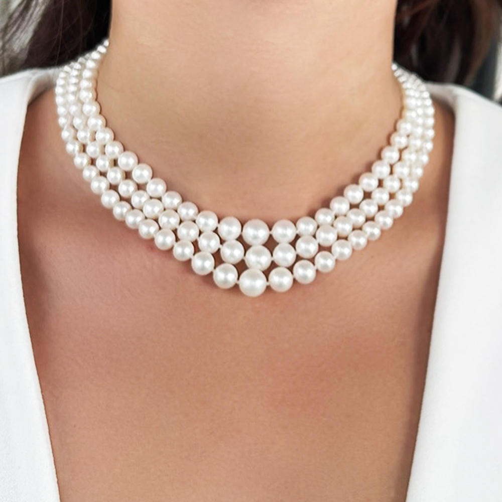 • Ένα υπέροχο κολιέ από 3 σειρές διαφορετικού μήκους, λευκά μαργαριτάρια γλυκού νερού Fresh Water Pearl με μαργαριτάρια που ξεκινούν από 4,5 χιλιοστά και στο κέντρο του φθάνουν 9,5 χιλιοστά, άριστης ποιότητας Degrade με σχήμα στρόγγυλο.