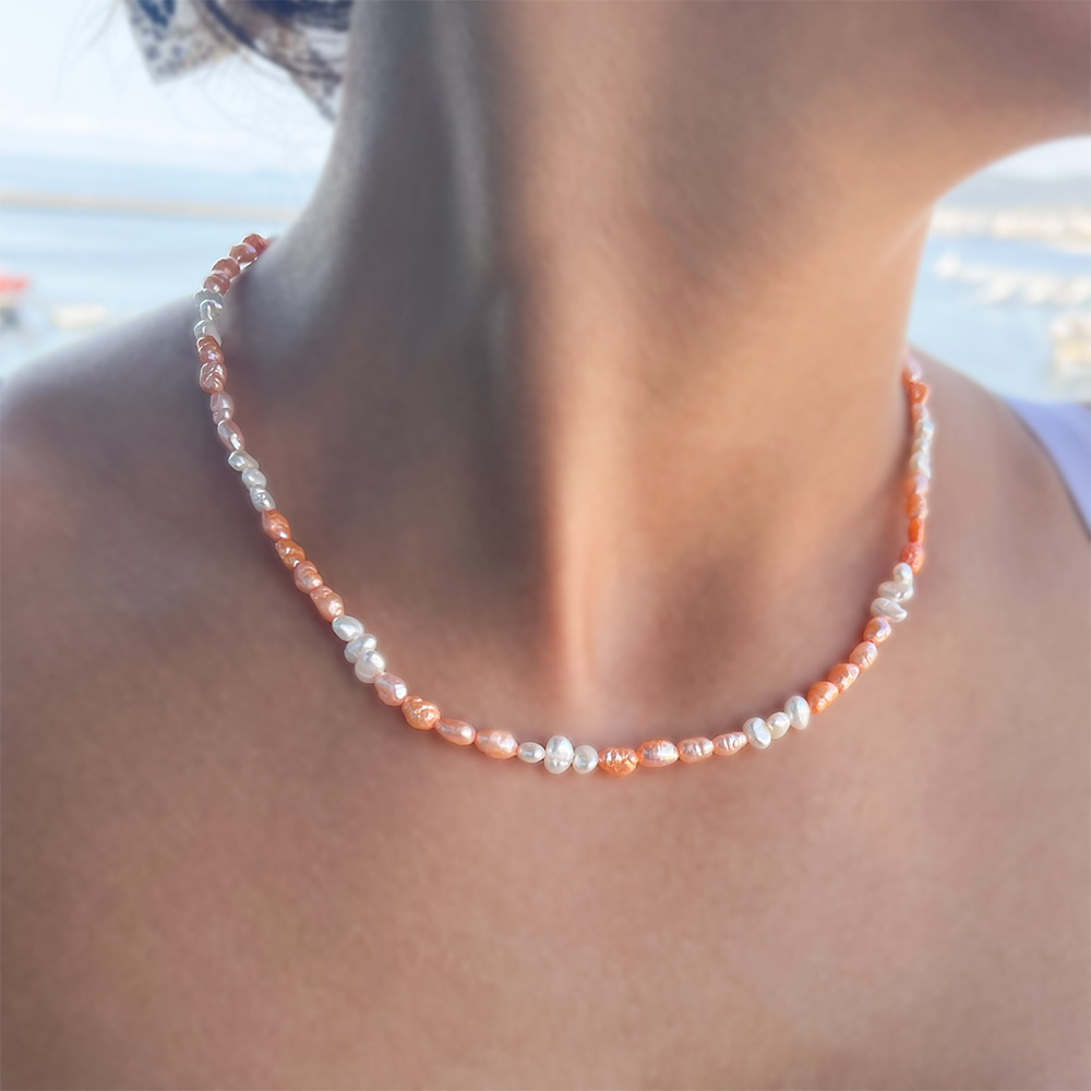 • Ένα πανέμορφο κολιέ με φυσικά ακατέργαστα μαργαριτάρια Fresh Water Pearl, διαμέτρου 5x7 χιλιοστών σε λευκή και πορτοκαλί απόχρωση.