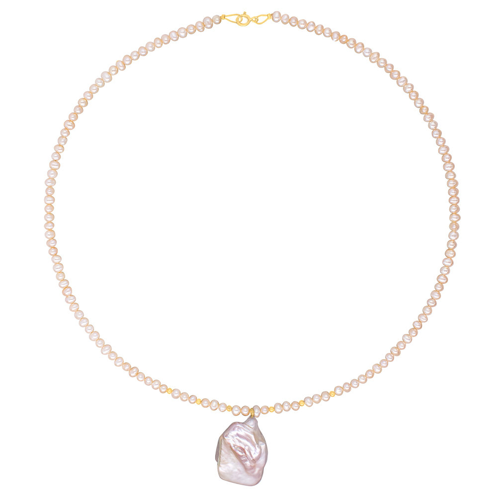 • Ένα υπέροχο κολιέ από σομόν μαργαριτάρια γλυκού νερού Fresh Water Pearl διαμέτρου από 5 - 5,5 χιλιοστών και ένα εντυπωσιακό κεντρικό μαργαριτάρι Baroque 16 Χ 20 χιλιοστών