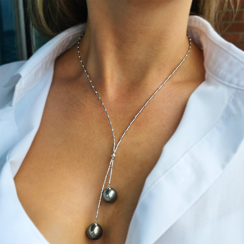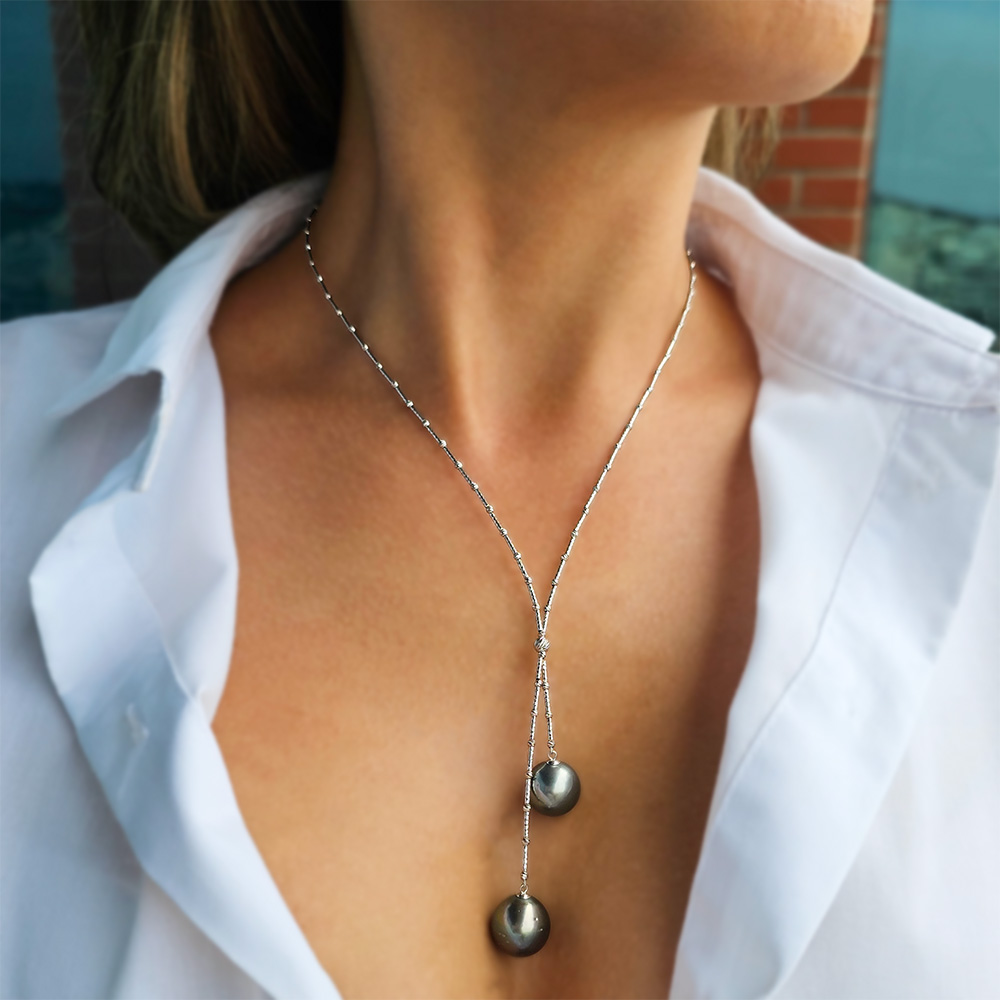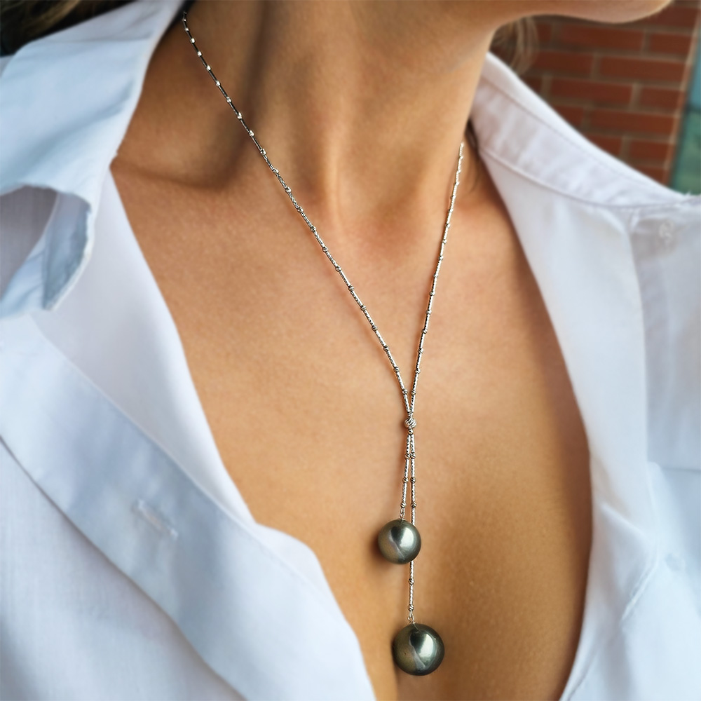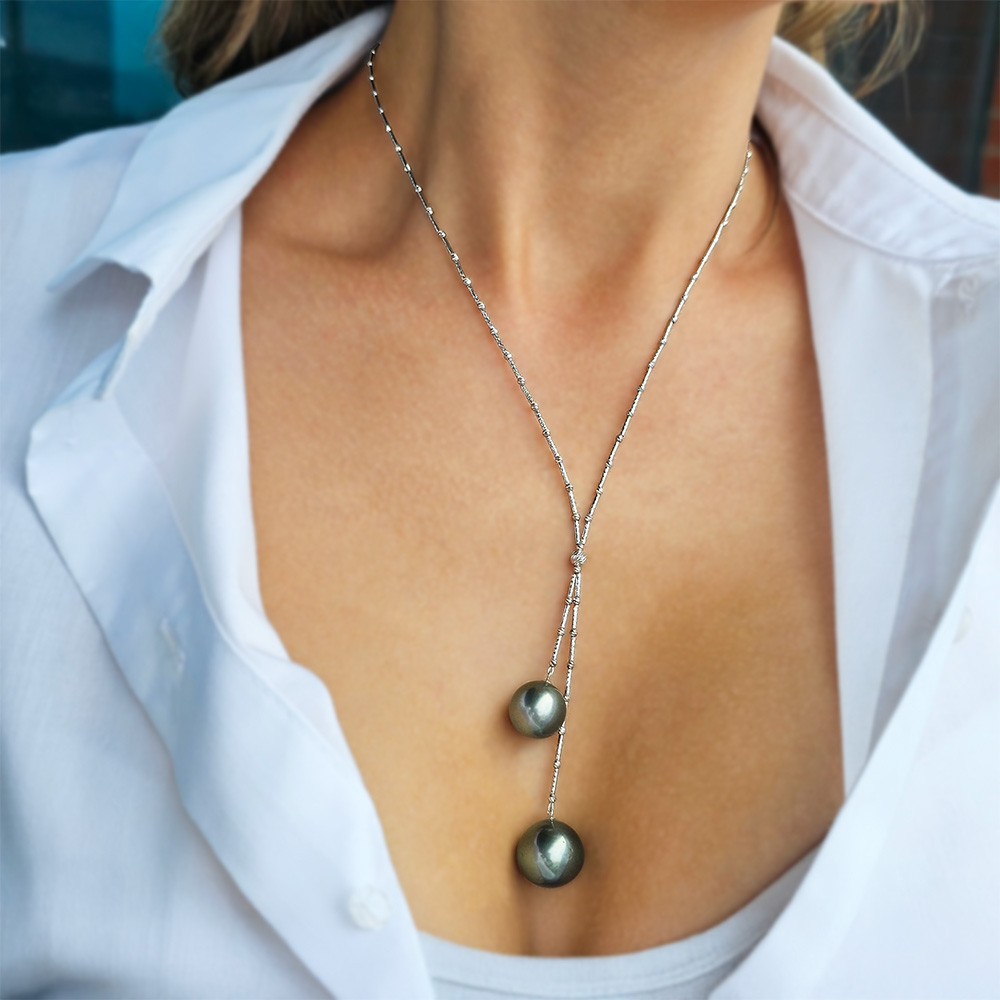 • Ένα μοναδικό κολιέ με 2 μαύρα φυσικά, σπάνια και εντυπωσιακά μαργαριτάρια South Sea Tahiti διαμέτρου 13 χιλιοστών και ένα μεγαλύτερο 15,1 χιλιοστών.