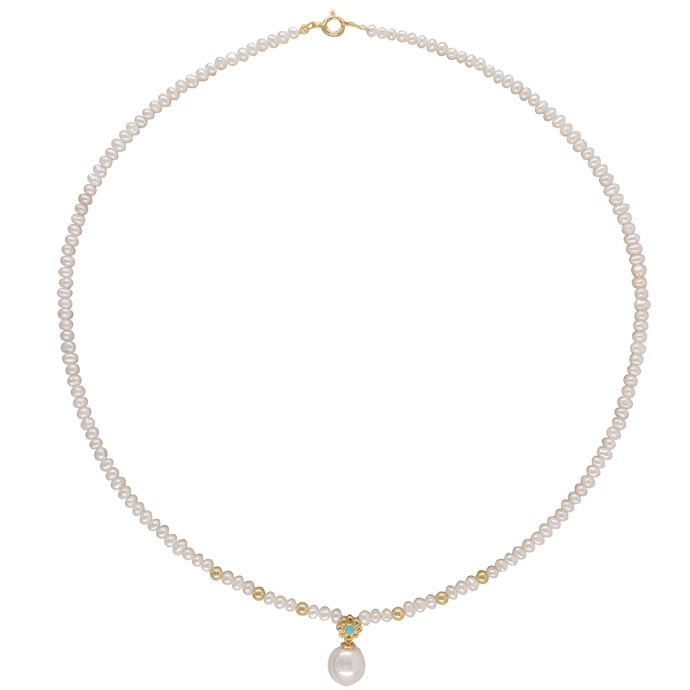 Στο κέντρο του κολιέ υπάρχει ένα μενταγιόν με λευκό μαργαριτάρι Fresh Water Pearl σε σχήμα σταγόνας, άριστης ποιότητας με διάσταση 8 x 10 χιλιοστών.