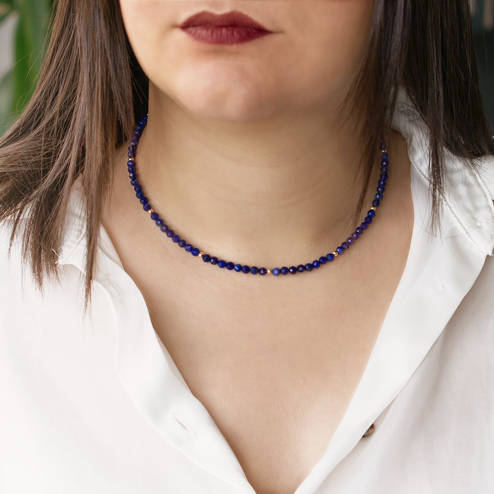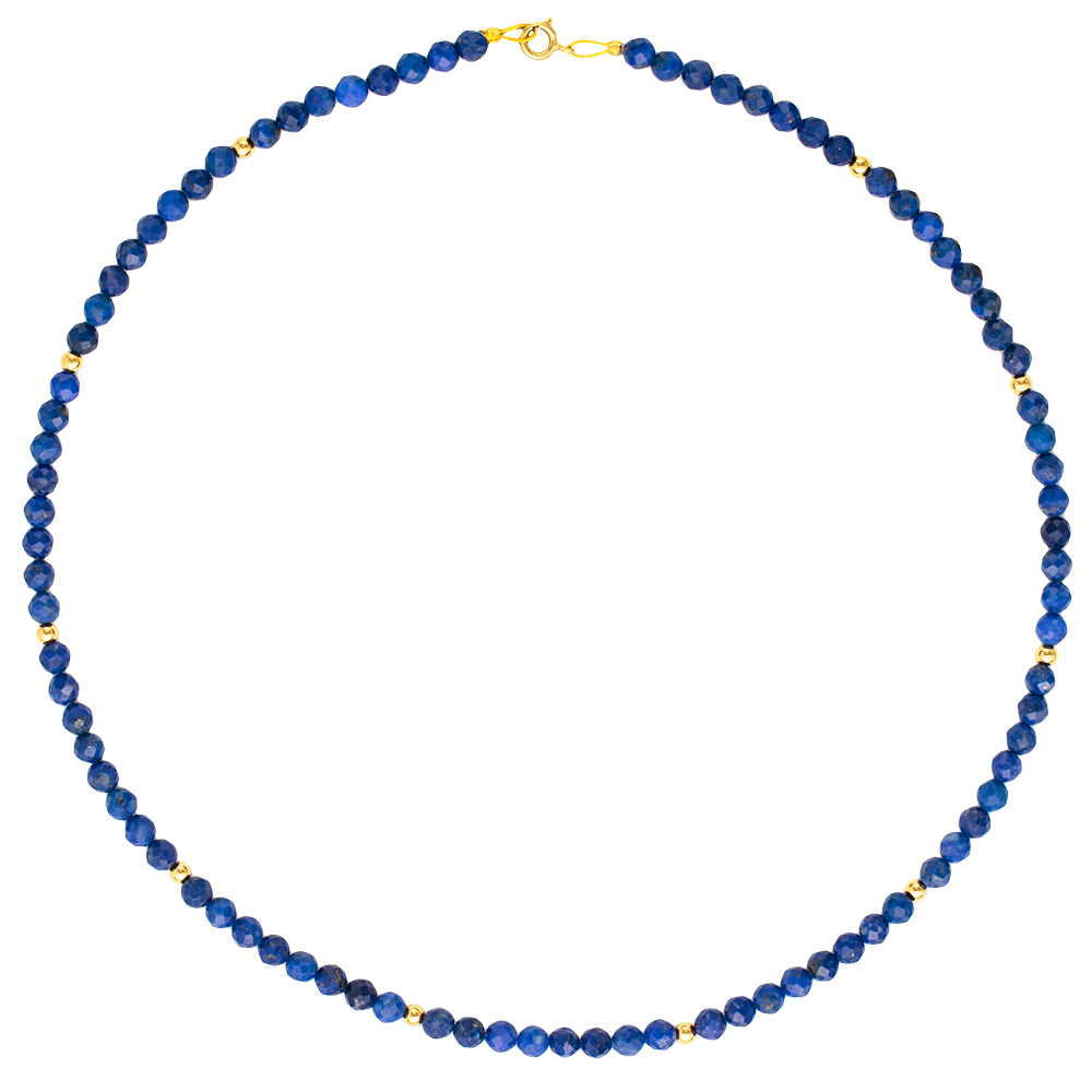 • Ένα υπέροχο κολιέ με φασεταρισμένο ημιπολύτιμο λίθο lapis διαμέτρου 4,5-5 χιλιοστών, άριστης ποιότητας.