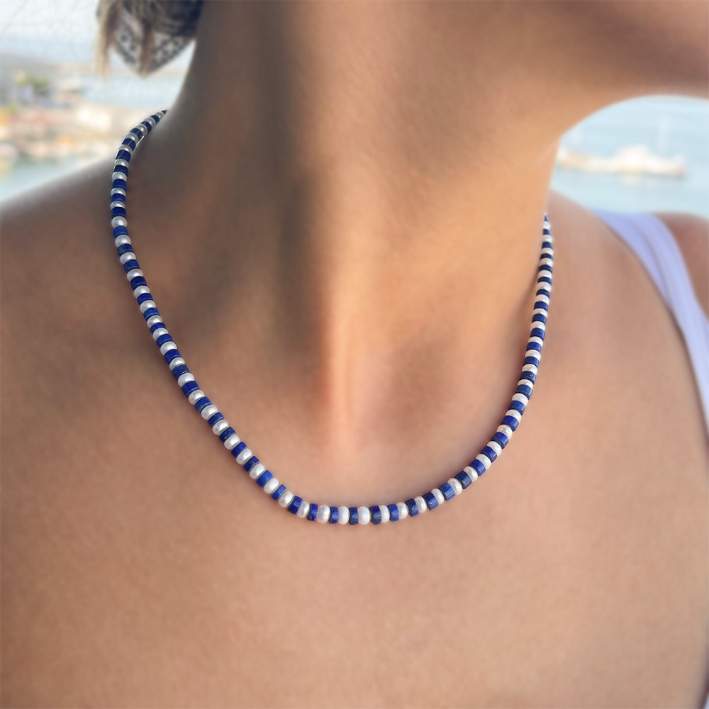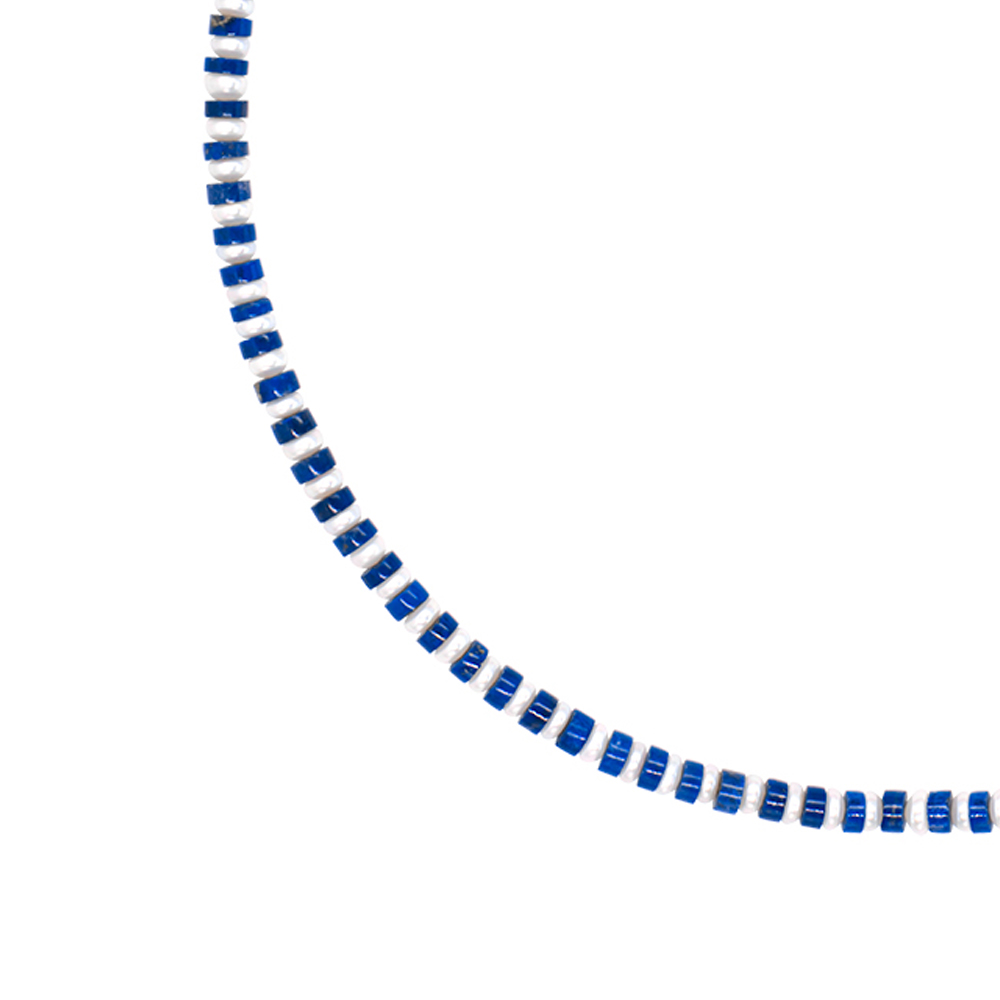 • Ένα υπέροχο κολιέ με 85 ημιπολύτιμους λίθους Lapis διαμέτρου 2,5 - 4 χιλιοστών, σε σχήμα ροδέλας και με 84 λευκά μαργαριτάρια Fresh Water Pearl 3 - 4 χιλιοστών.