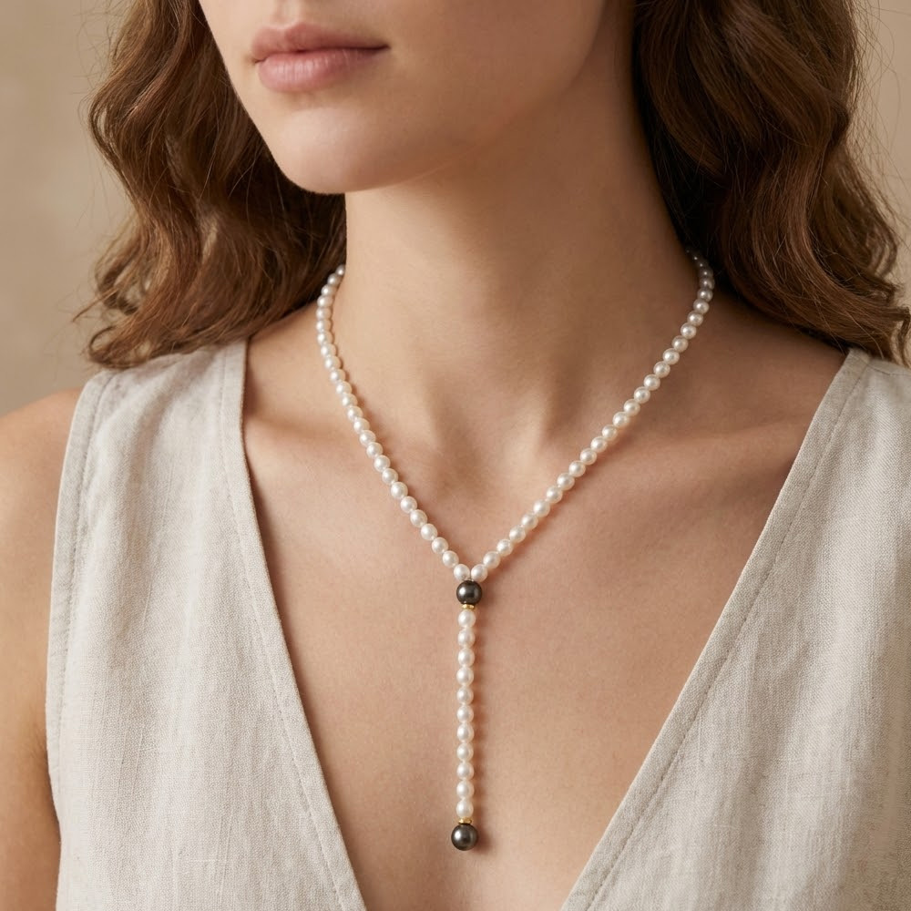 Στο κάτω μέρος του υπάρχουν 2 εντυπωσιακά μαύρα μαργαριτάρια Fresh Water Pearl σε σχήμα Roundδιαμέτρου 7,5x8 χιλιοστά και η απόσταση μεταξύ των μαύρων μαργαριταριών είναι 11 εκατοστά.