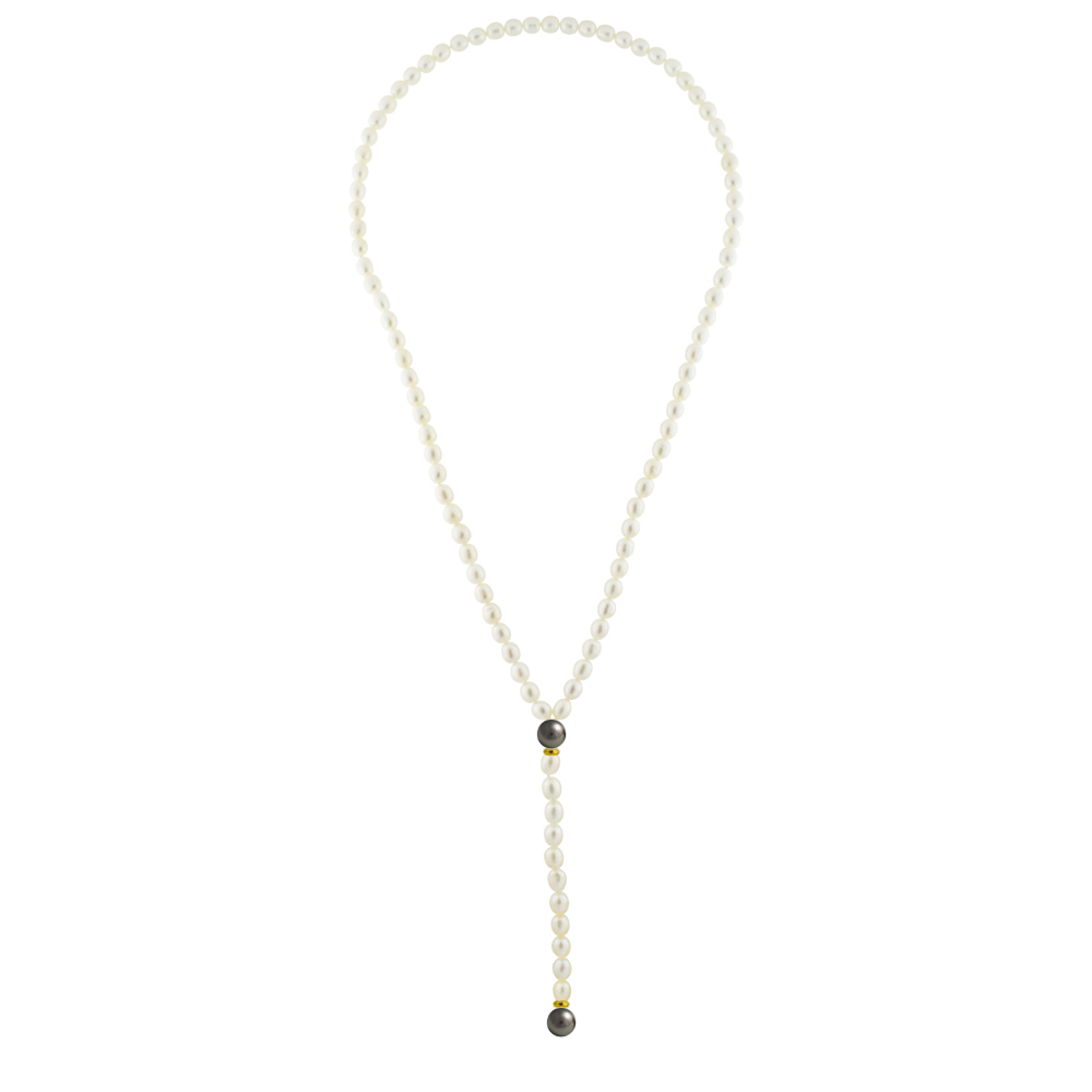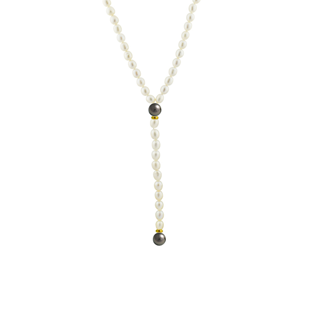 -10% Κολιέ με Κ14 χρυσά στοιχεία και λευκά και μαύρα μαργαριτάρια - M122720B