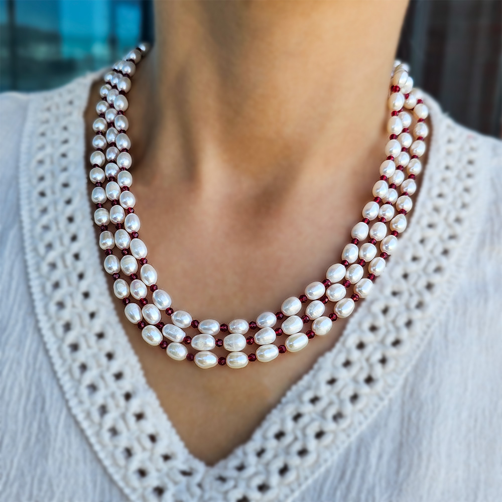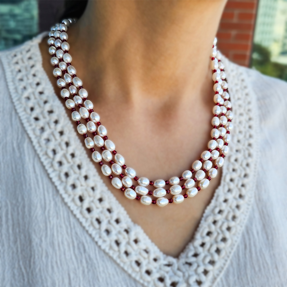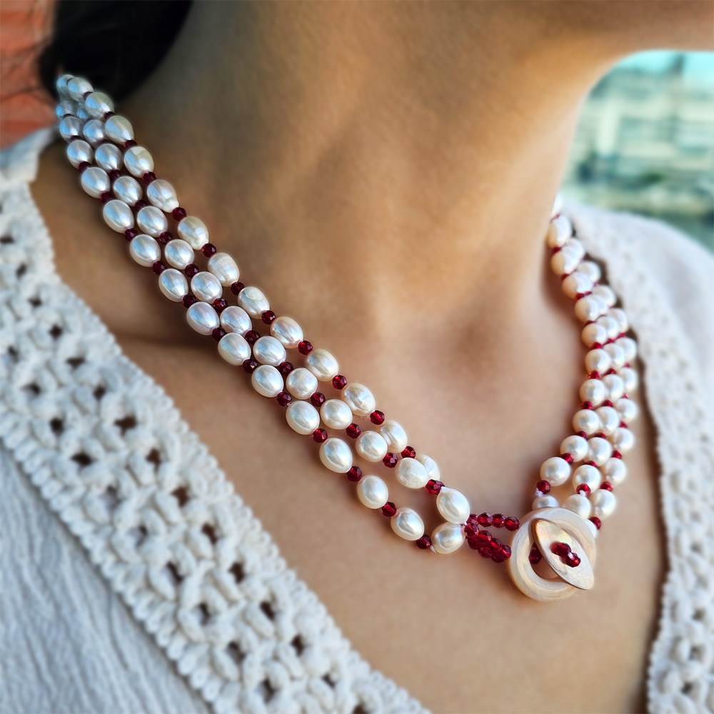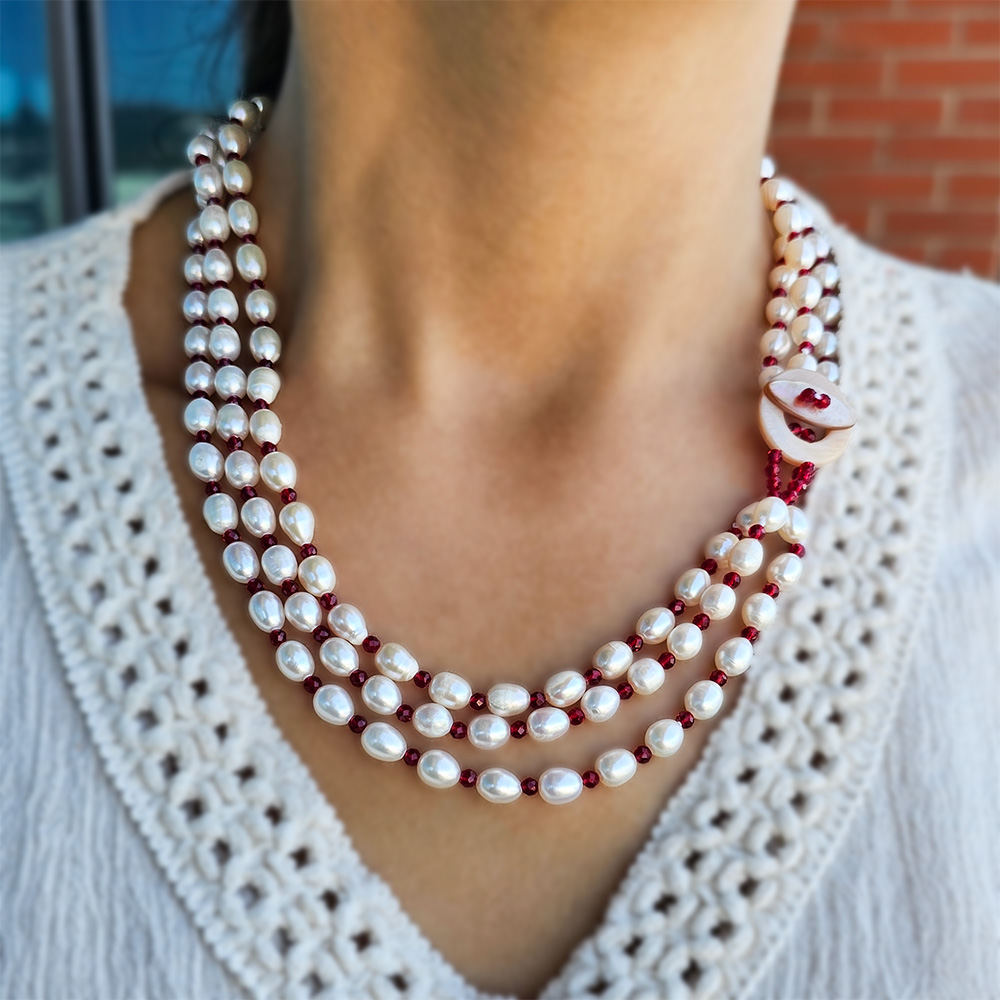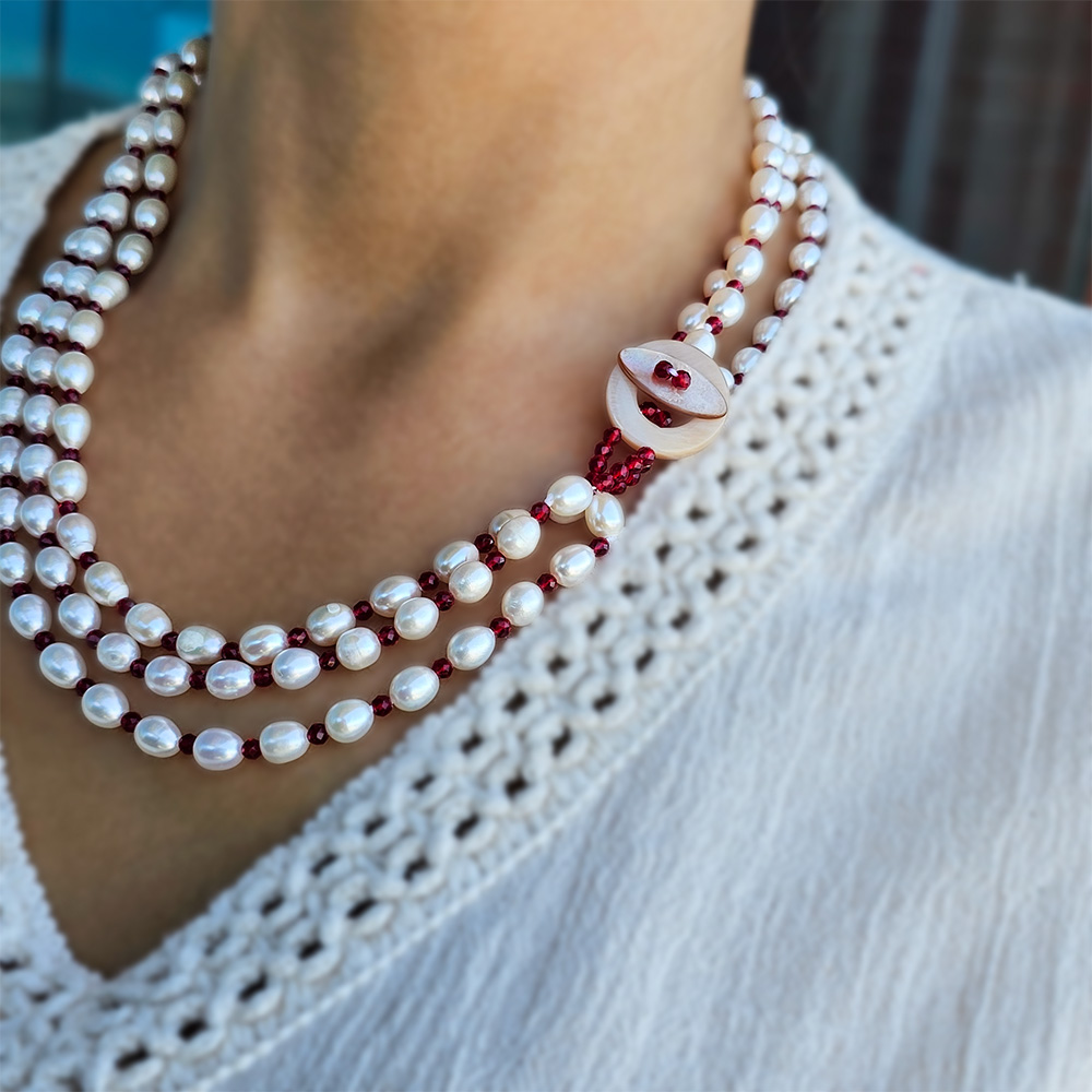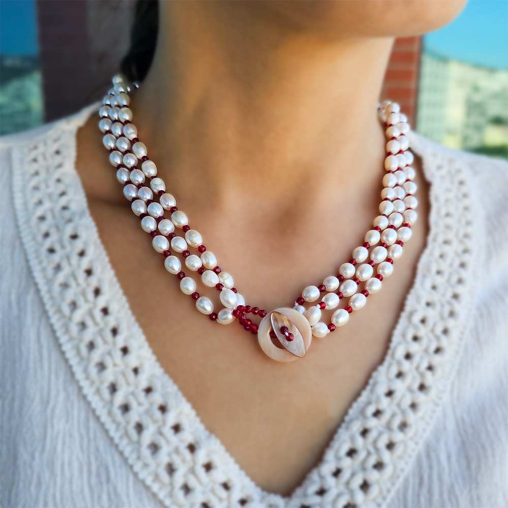Κολιέ με 3 σειρές λευκά μαργαριτάρια, salomite κόκκινο και κουμπωμα από Mother Of Pearl - F126497
